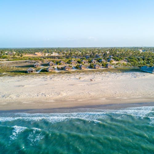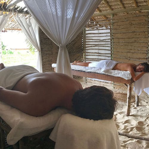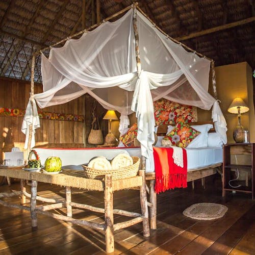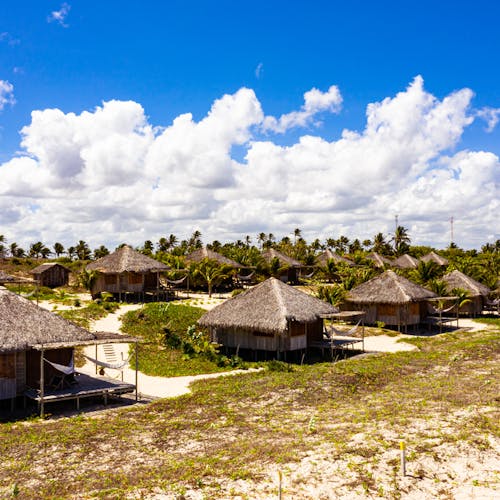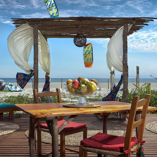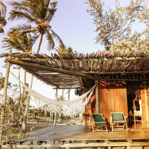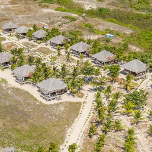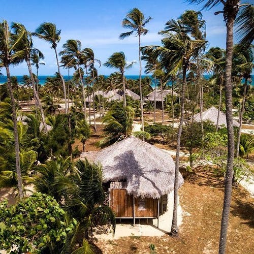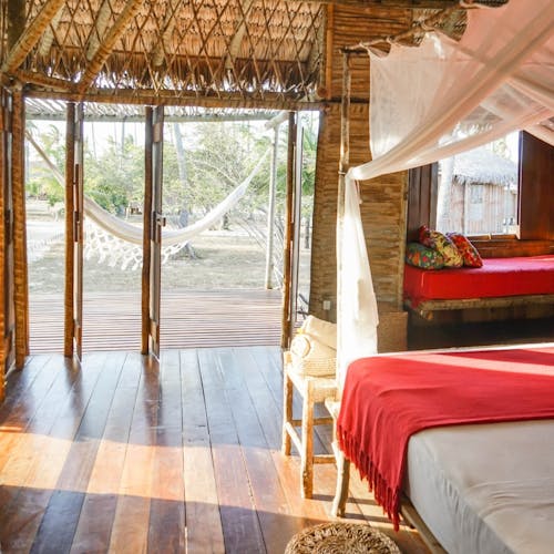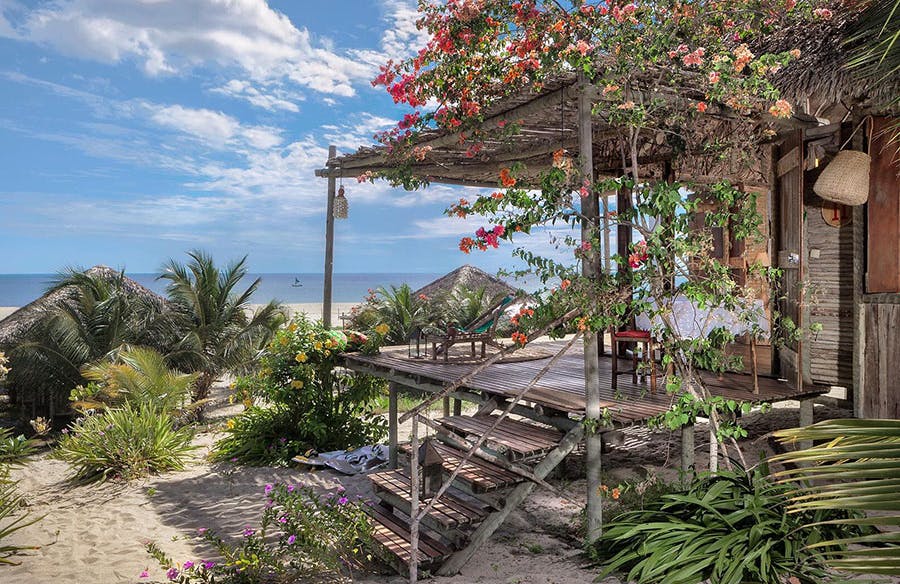 Bangalôs naturais que nem precisam de ar condicionado: a brisa do mar basta pela forma como são construídos e os materiais utilizados. Você sai da sua cabana direto na areia da praia.