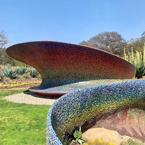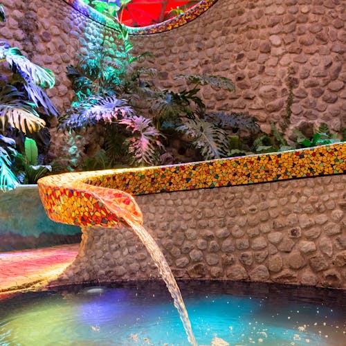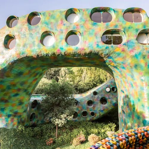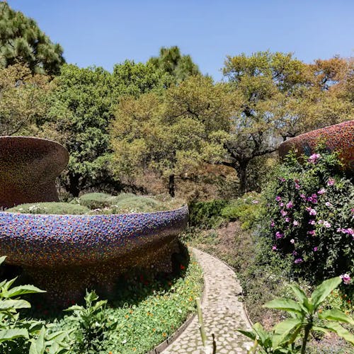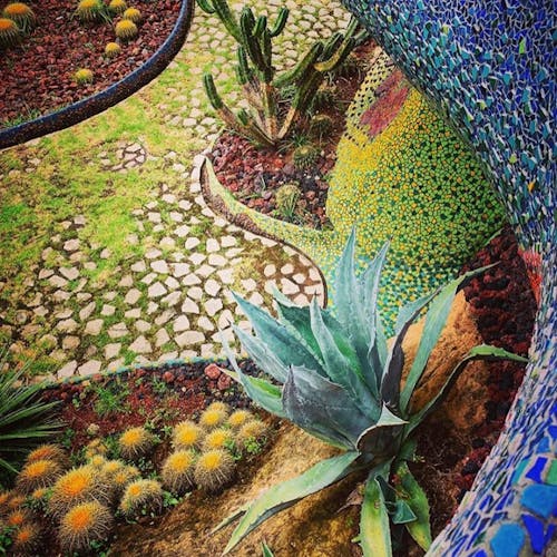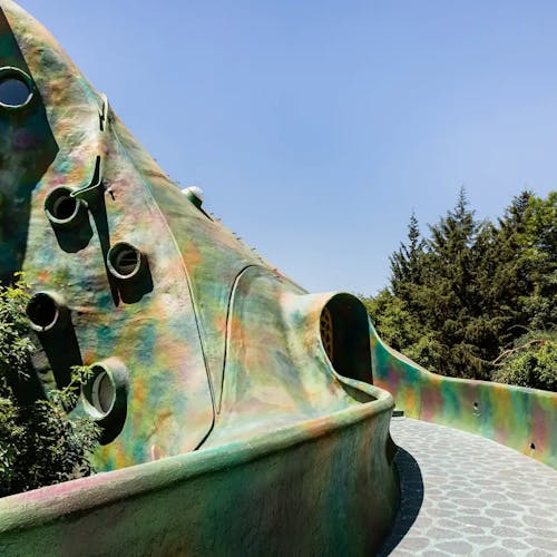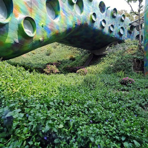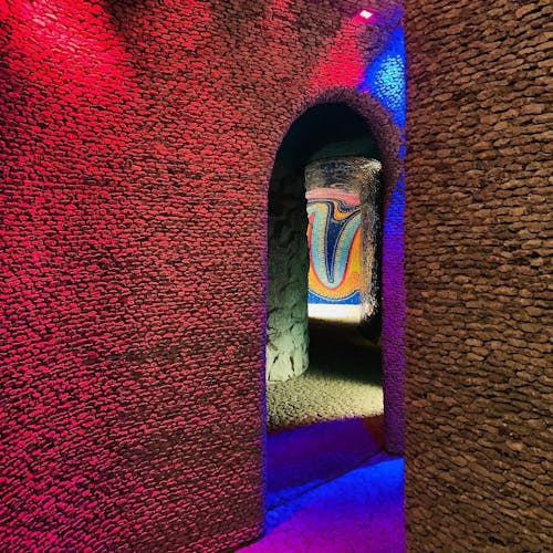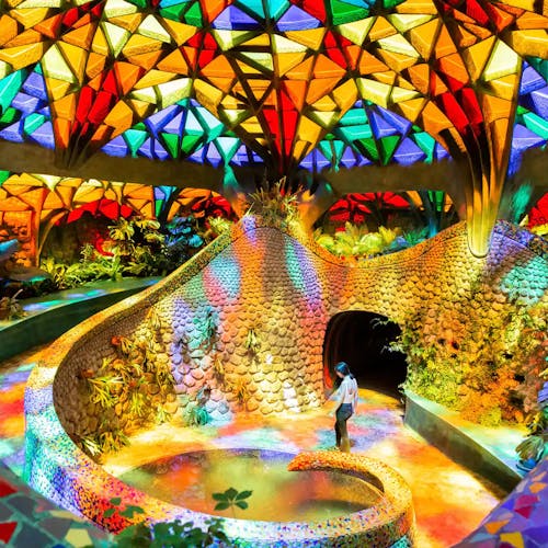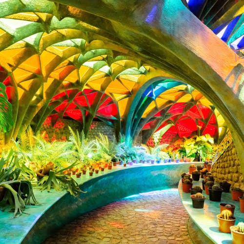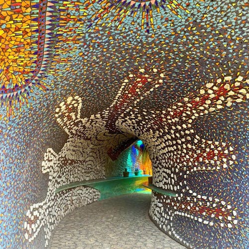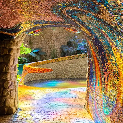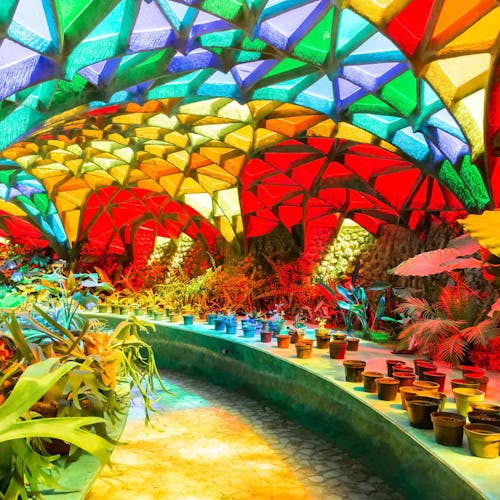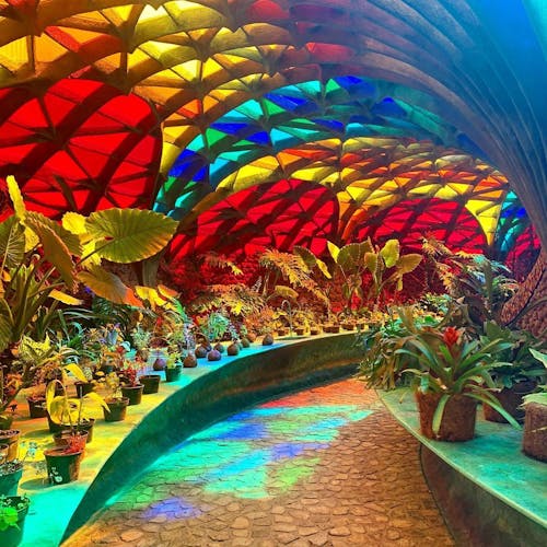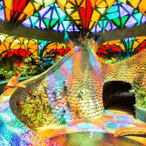 Outro ponto interessante de visita dentro do espaço do parque, são as cavernas coloridas e a estufa repleta de plantas e túneis com ladrilhos cheios de cor por toda parede e teto.