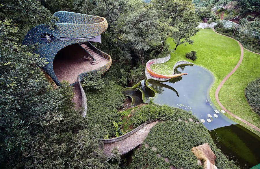 A casa foi nomeada em homenagem a um deus metade pássaro metade serpente venerado pelos astecas, é uma combinação de parque exótico e complexo habitacional construído dentro de uma escultura gigante, intrincadamente decorada e de cores vivas que exalam para dentro e para fora da paisagem. É uma obra-prima projetada por Javier Senosiain, o arquiteto mexicano que foi o pioneiro desse estilo de "arquitetura orgânica". Espaçosa, com janelas arredondadas, tetos curvos e outras características arquitetônicas peculiares construídas dentro da barriga da cobra. A decoração e os acessórios modernos conferem ao local uma sensação arejada que se adapta ao ambiente primitivo.