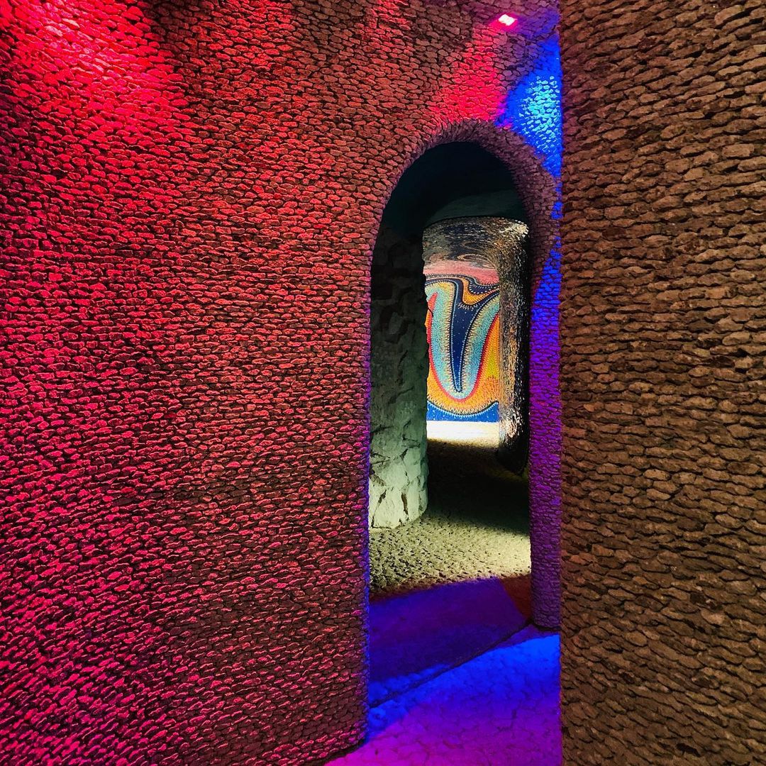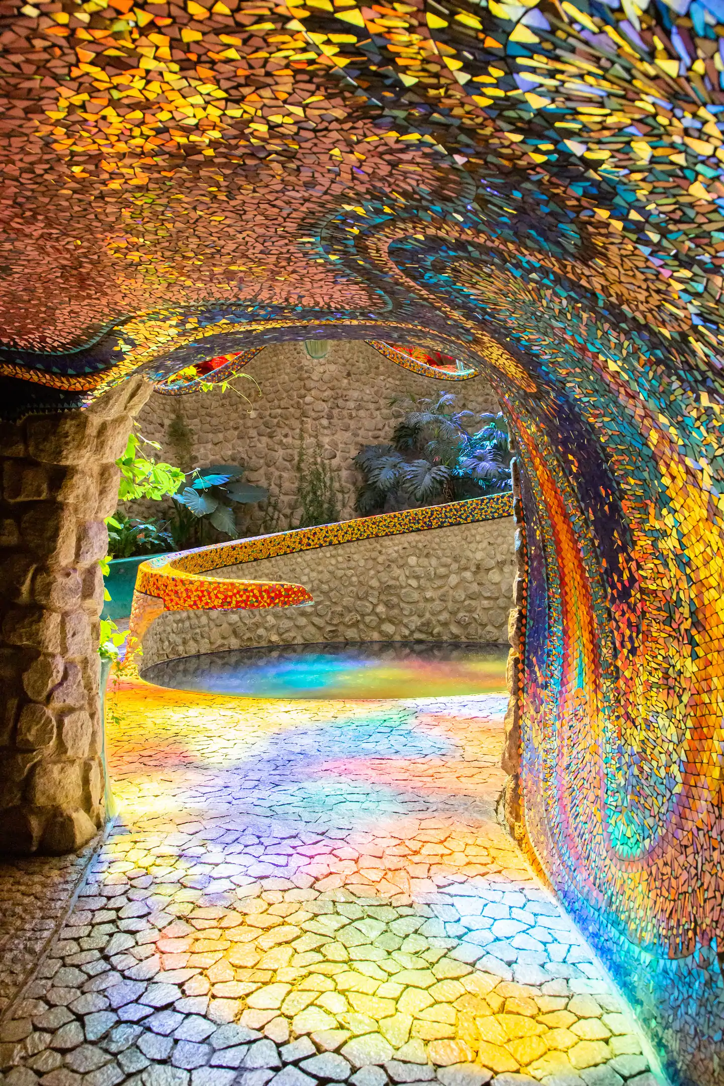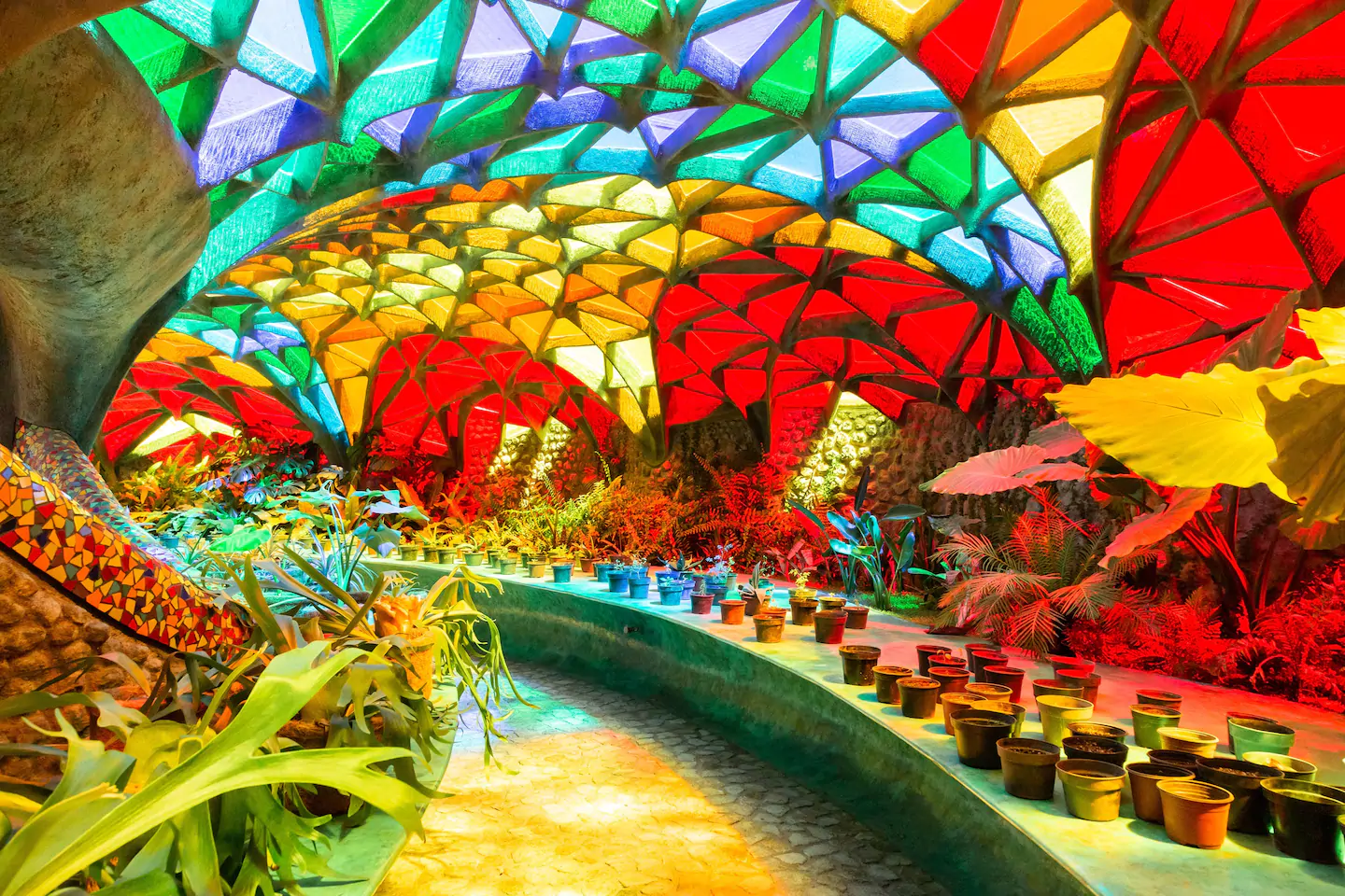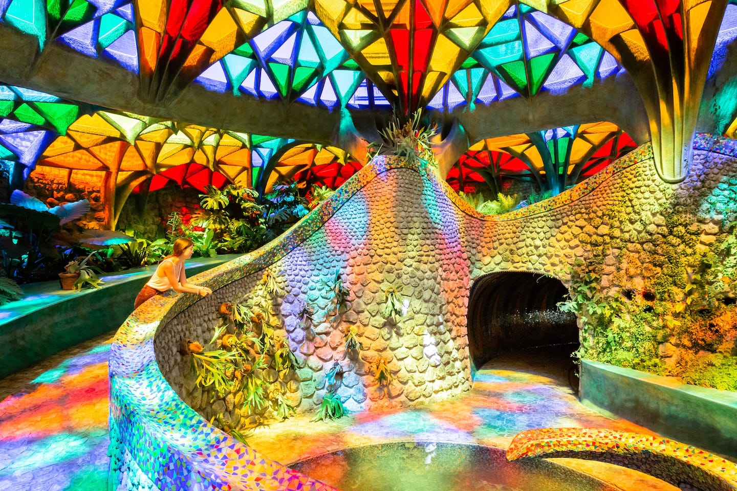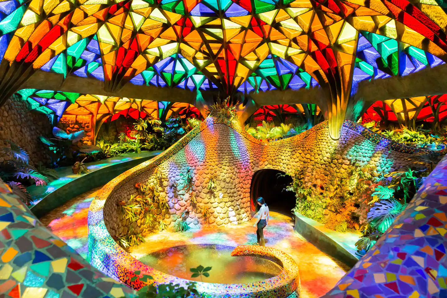 Outro ponto interessante de visita dentro do espaço do parque, são as cavernas coloridas e a estufa repleta de plantas e túneis com ladrilhos cheios de cor por toda parede e teto.