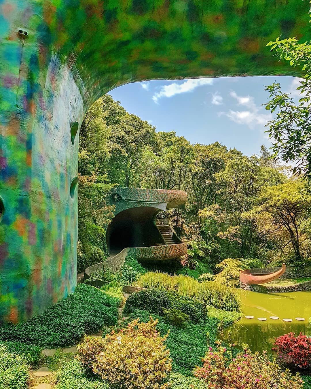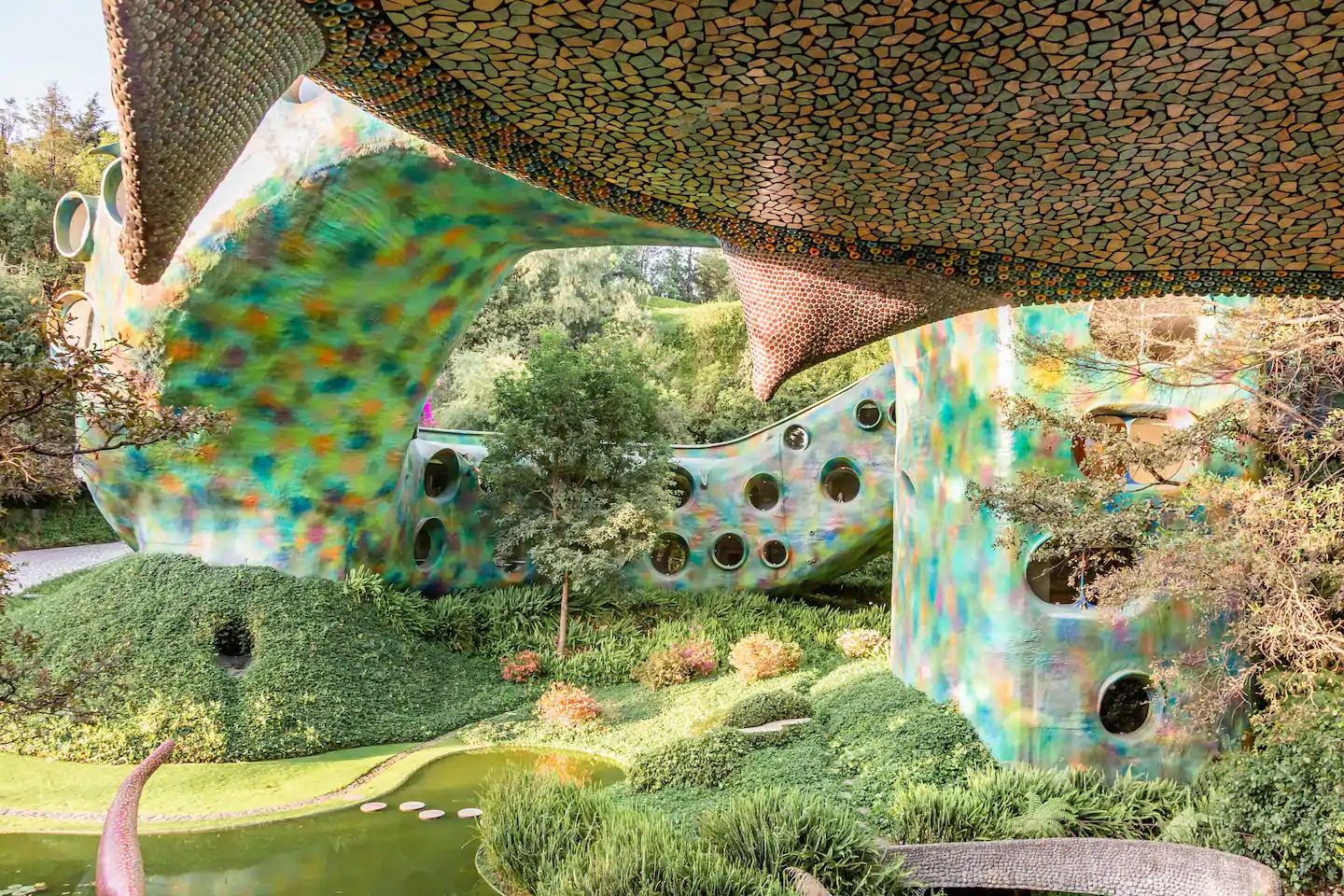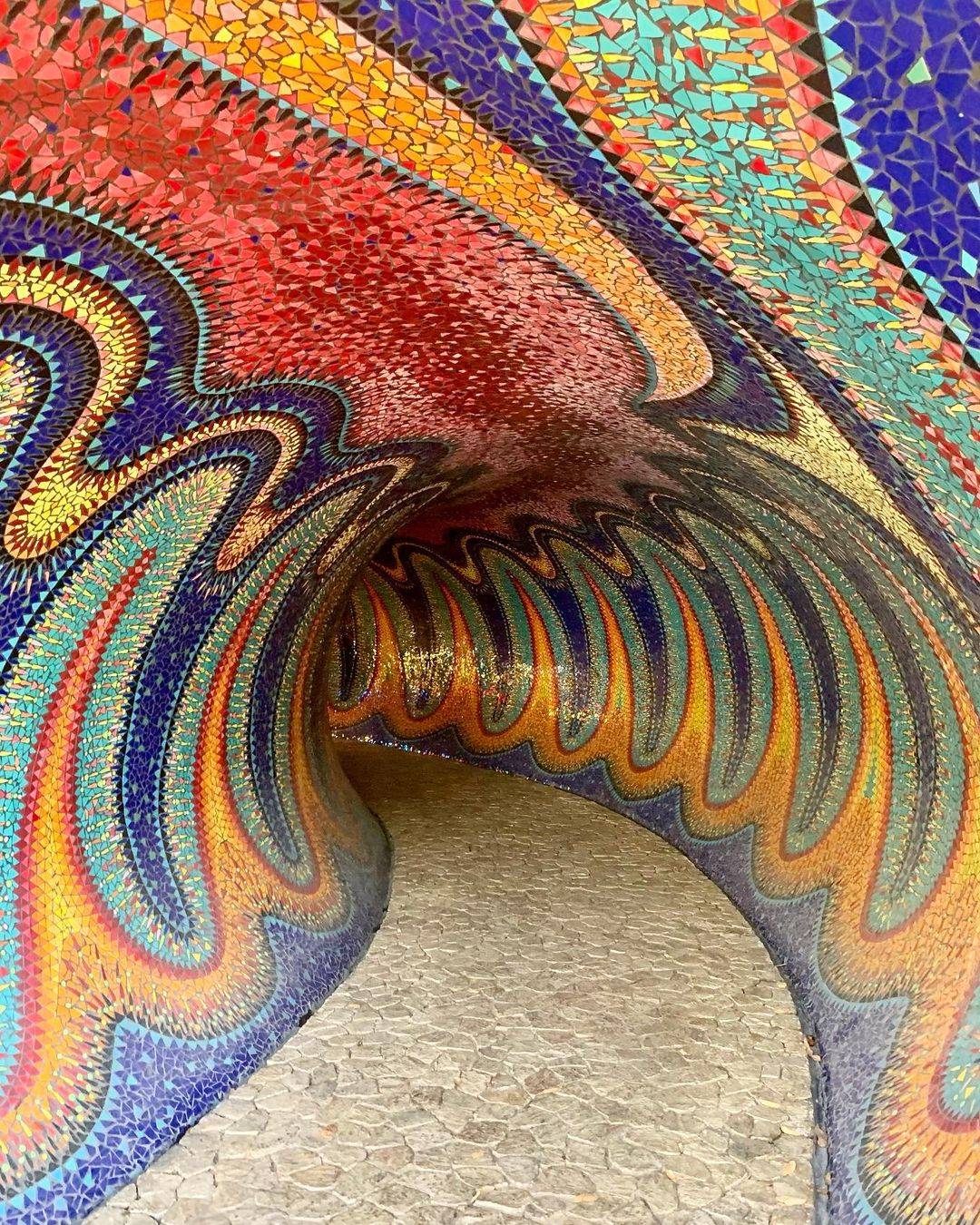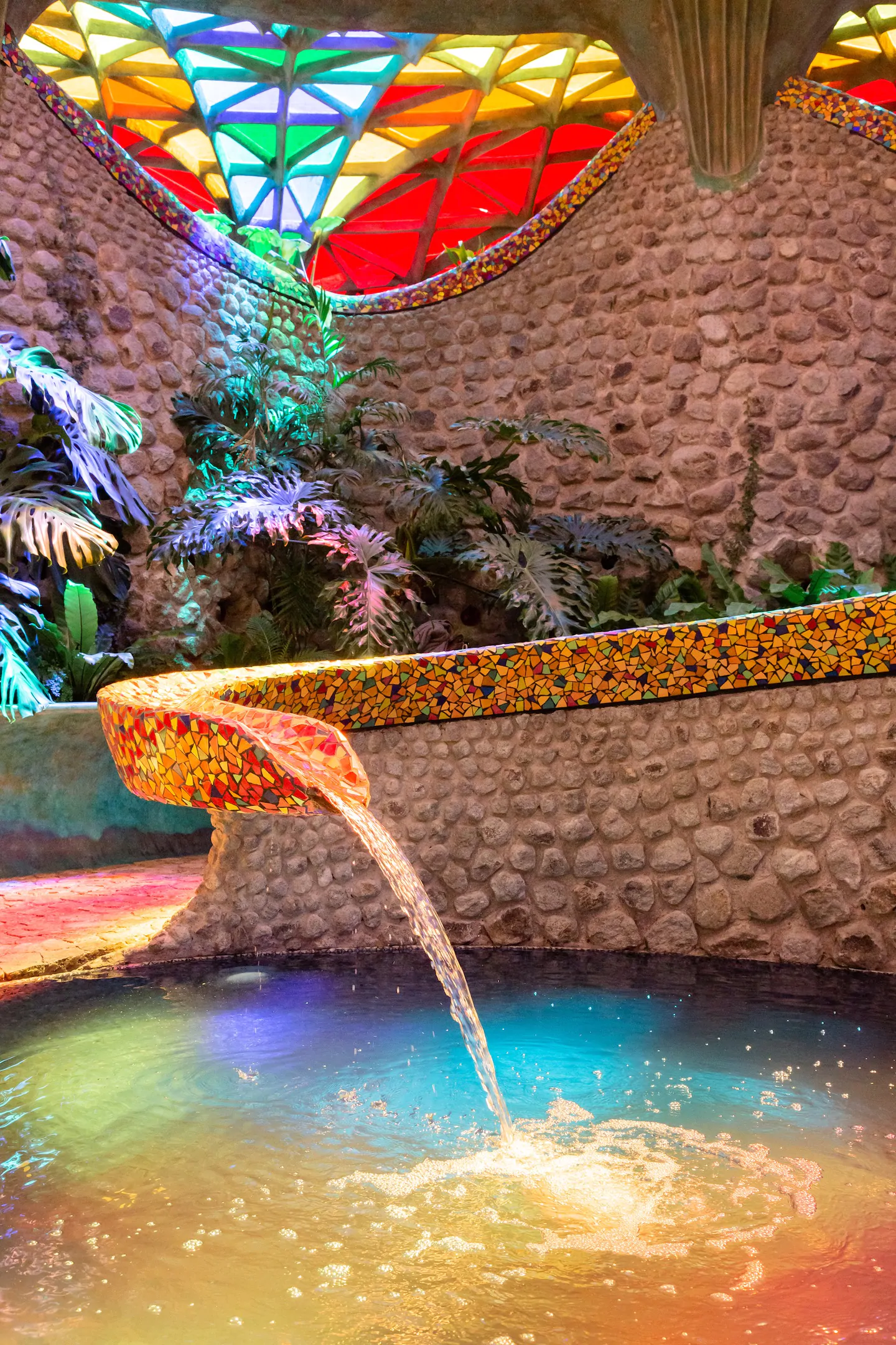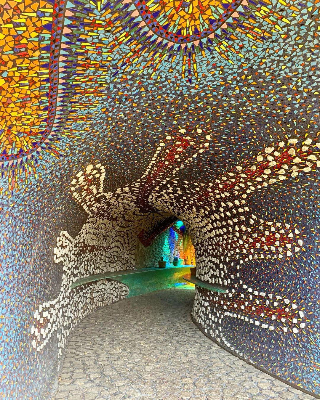 Outro ponto interessante de visita dentro do espaço do parque, são as cavernas coloridas e a estufa repleta de plantas e túneis com ladrilhos cheios de cor por toda parede e teto.