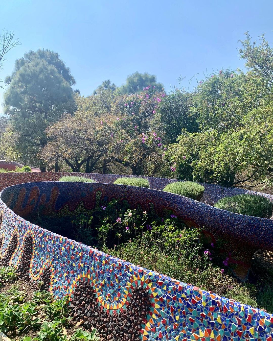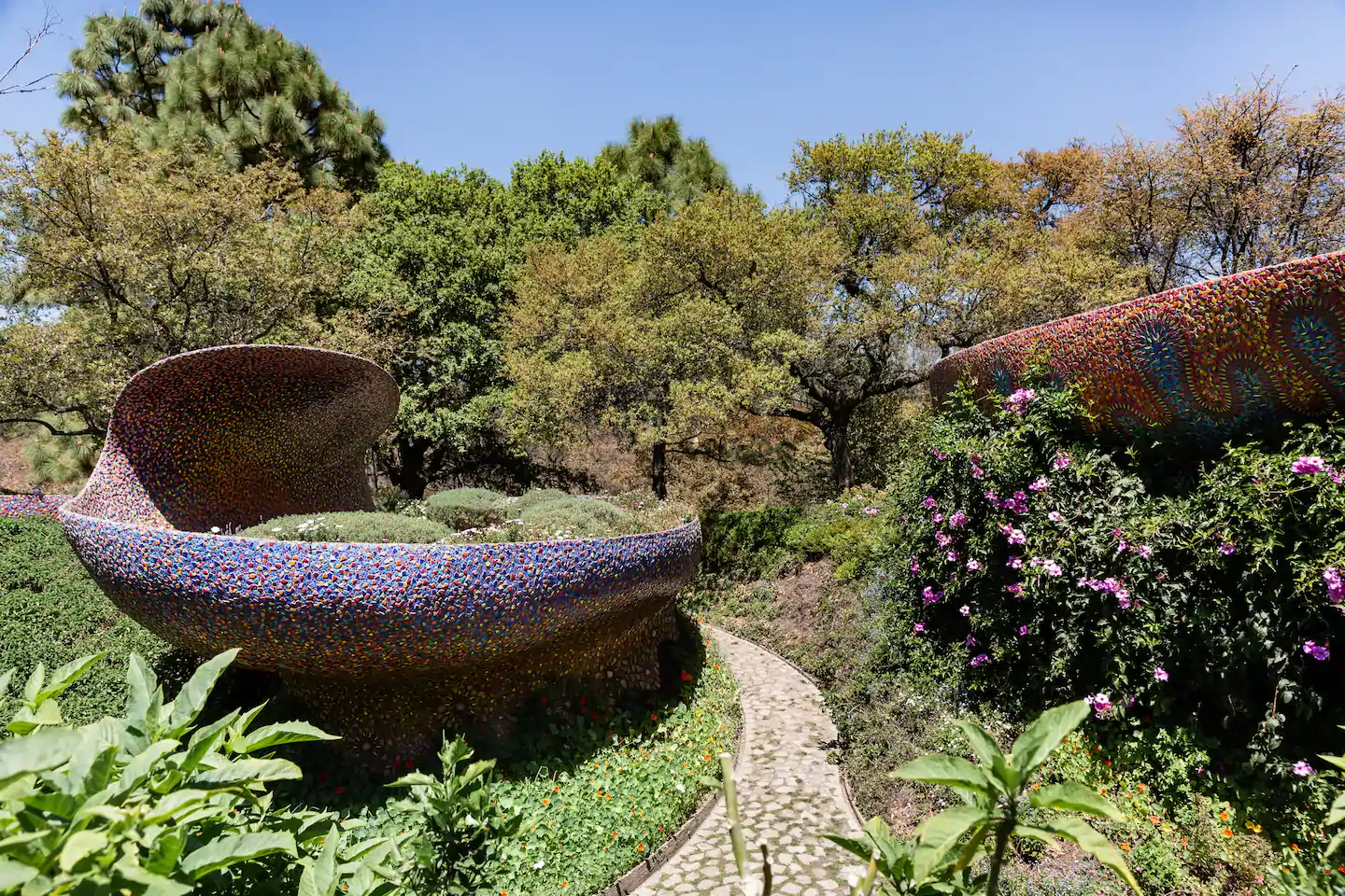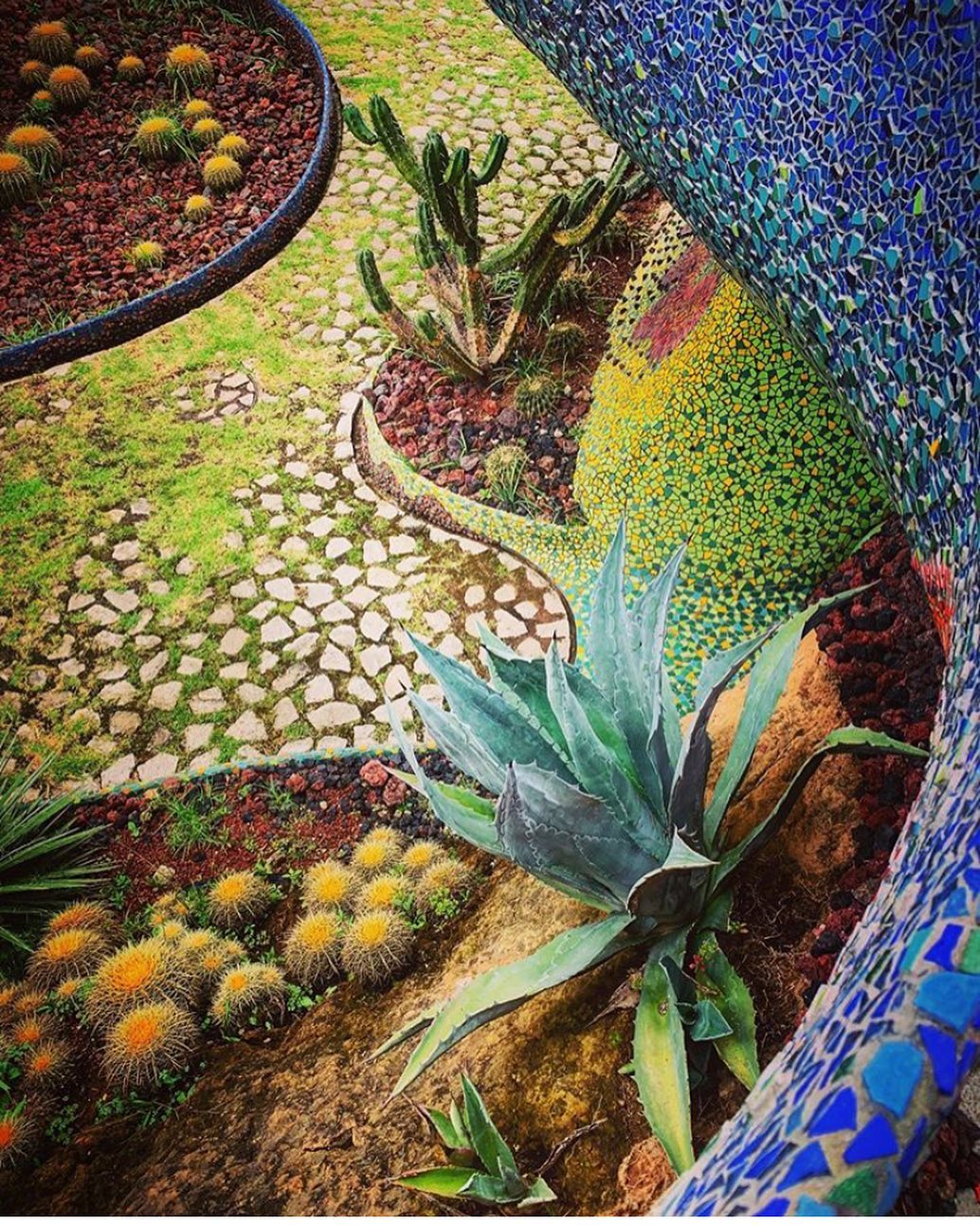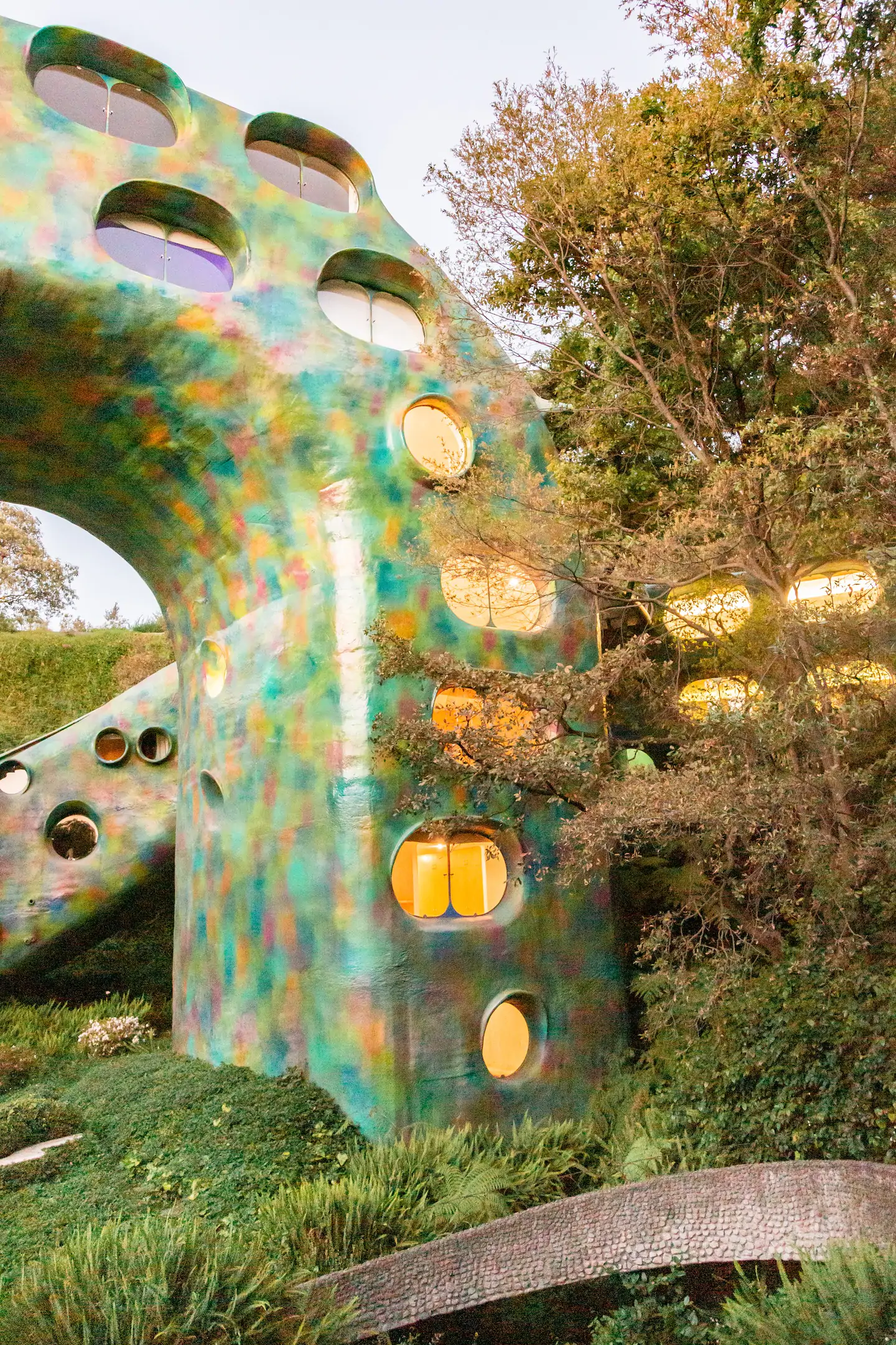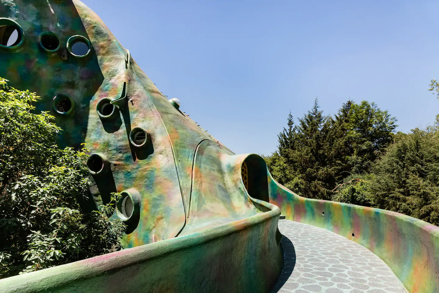 Outro ponto interessante de visita dentro do espaço do parque, são as cavernas coloridas e a estufa repleta de plantas e túneis com ladrilhos cheios de cor por toda parede e teto.