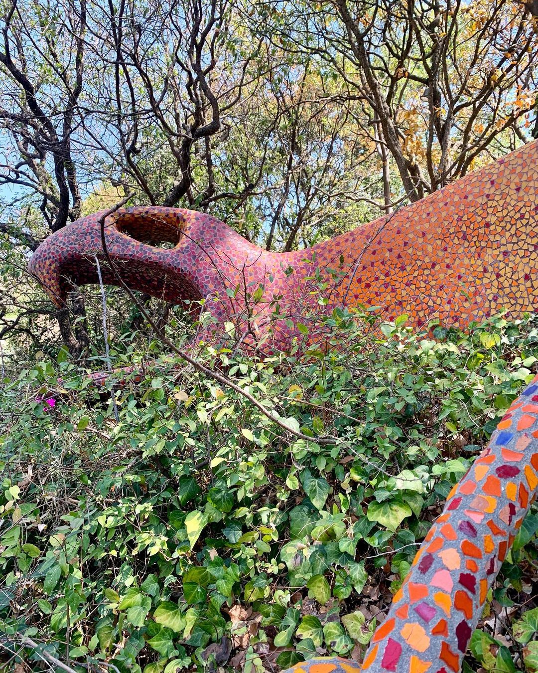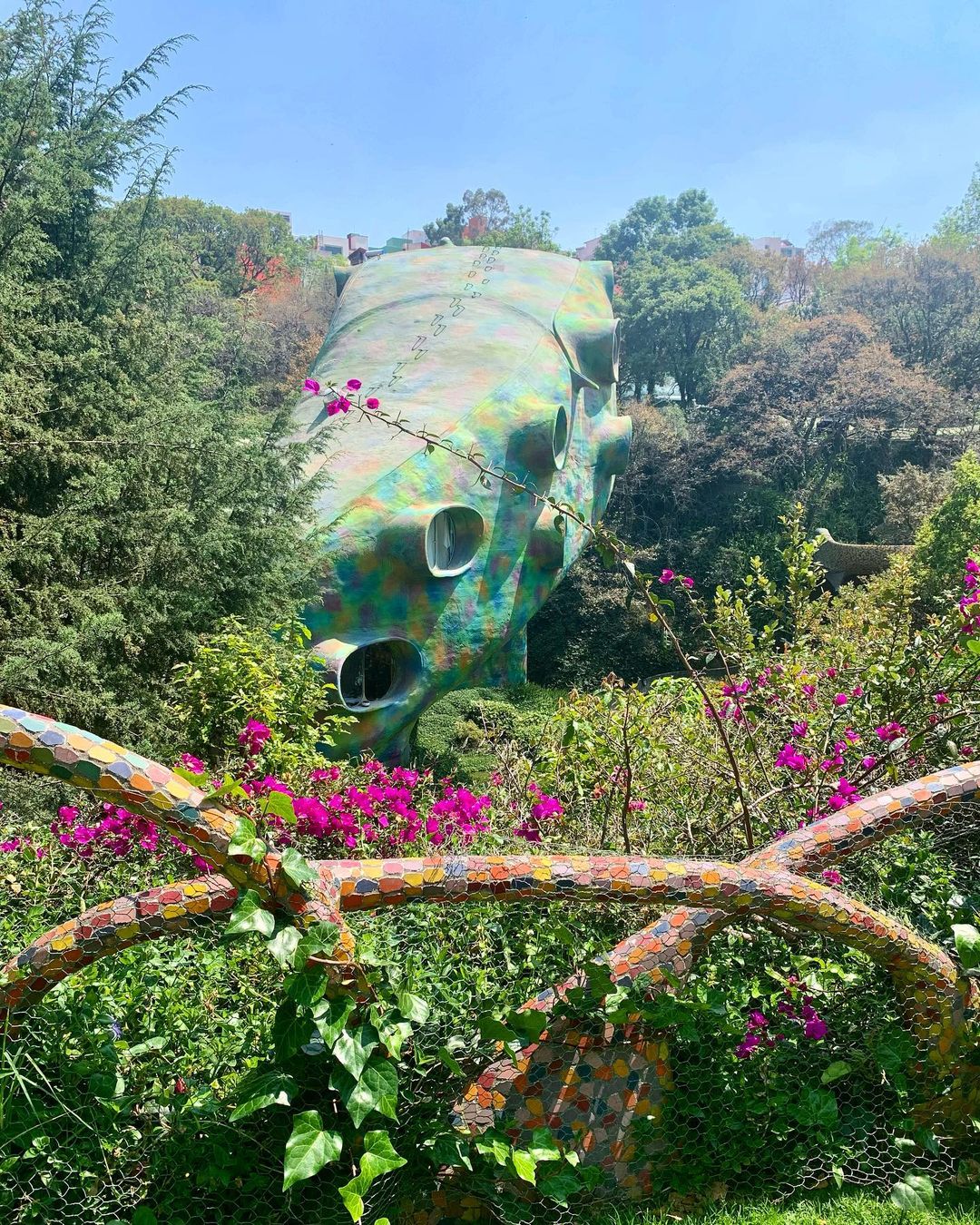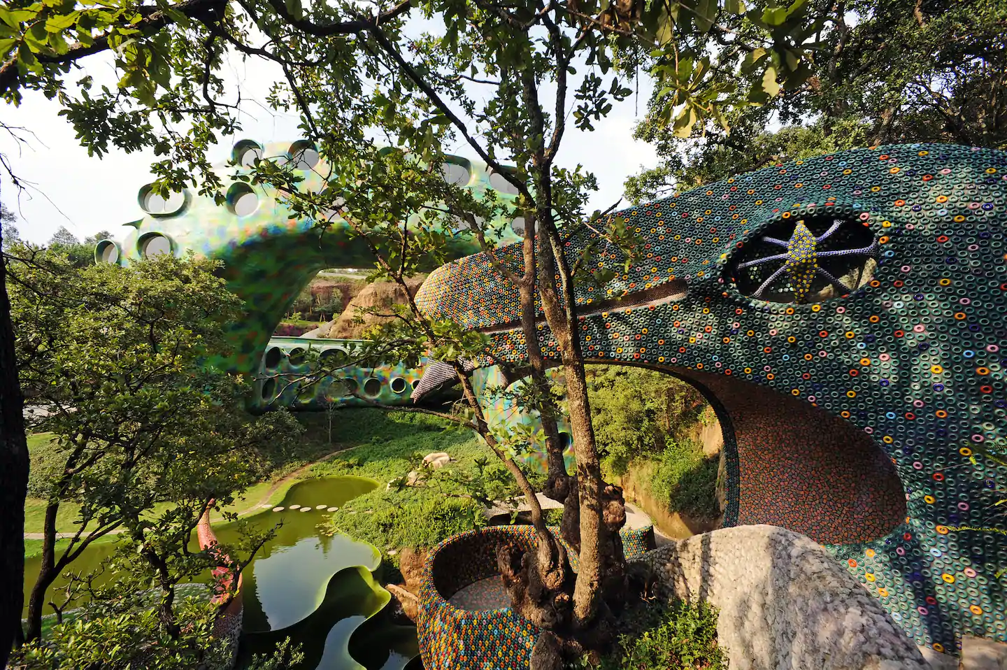 A boca da cobra é construída ao redor de uma caverna natural, leva os visitantes a observar as diferentes flores e árvores, os sons da floresta e a variedade de texturas, naturais e artificiais. Círculos de cerâmica coloridos incrustados na cabeça, olhos e presas da cobra, assim como outros detalhes são inspirados na arte Huichol.