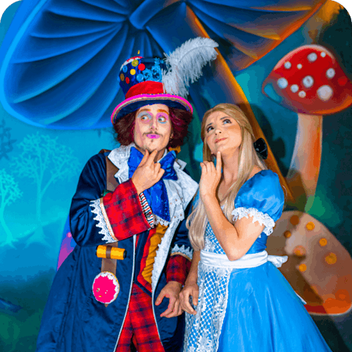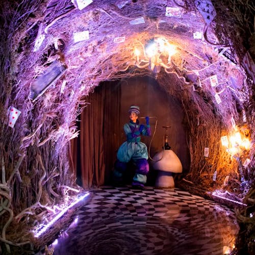 A experiência: Ao chegar, após atravessar uma cortina azul, a LAGARTA irá te recepcionar fumando seu narguilé até te levar para cair na toca do coelho e chegar ao salão principal. (Se for necessário esperar, há uma sala de espera repleta de lustres de cristal e livros flutuantes). Além disso há ainda a Mesa do Chapeleiro, uma Alice gigante de 3 metros, a Floresta de Cogumelos e shows pontuais dos personagens que acontecem em entradas especiais durante a noite e no final os presentes são convidados a tirar fotos na mesa de chá com os personagens. O ambiente interno em luz mais baixa dá o tom de mistério na experiência logo no início. Todos os garçons usam uniforme vestidos de cartas de baralho - referência aos guardas da Rainha de Copas.