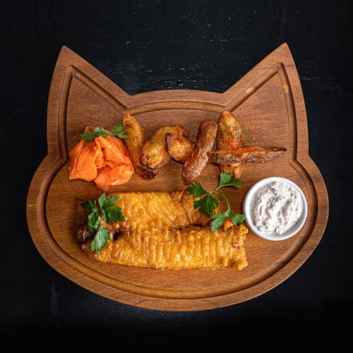 - 🐟 Gato FIsh and Chips - Filé de tilápia feita no tempurá. Acompanha batatas rústicas, molho tártaro e picles de cenoura
