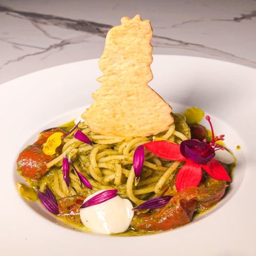 - 🍝 Alice Jardim de Flores - Espaguete ao molho pesto, tomate assado, tomate cereja, mussarela de búfala, flores comestíveis e crocante de queijo 🌱 *vegetariano