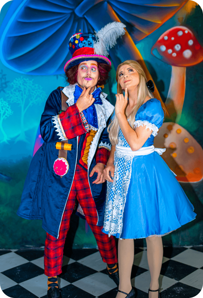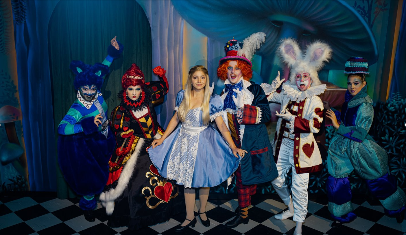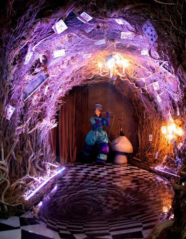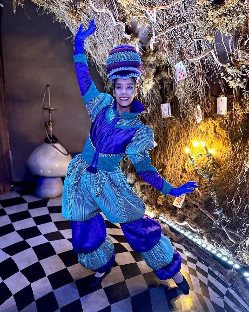 A experiência: Ao chegar, após atravessar uma cortina azul, a LAGARTA irá te recepcionar fumando seu narguilé até te levar para cair na toca do coelho e chegar ao salão principal. (Se for necessário esperar, há uma sala de espera repleta de lustres de cristal e livros flutuantes). Além disso há ainda a Mesa do Chapeleiro, uma Alice gigante de 3 metros, a Floresta de Cogumelos e shows pontuais dos personagens que acontecem em entradas especiais durante a noite e no final os presentes são convidados a tirar fotos na mesa de chá com os personagens. O ambiente interno em luz mais baixa dá o tom de mistério na experiência logo no início. Todos os garçons usam uniforme vestidos de cartas de baralho - referência aos guardas da Rainha de Copas.