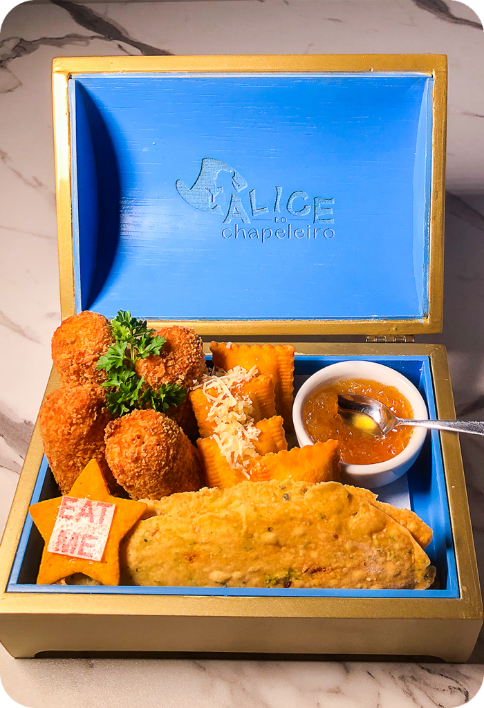- 🪄 Entrada: Baú Encantando diversas delícias como croquete de salame da serra e queijo colonial, tortéi frito e biscoitos com geleia de pimenta