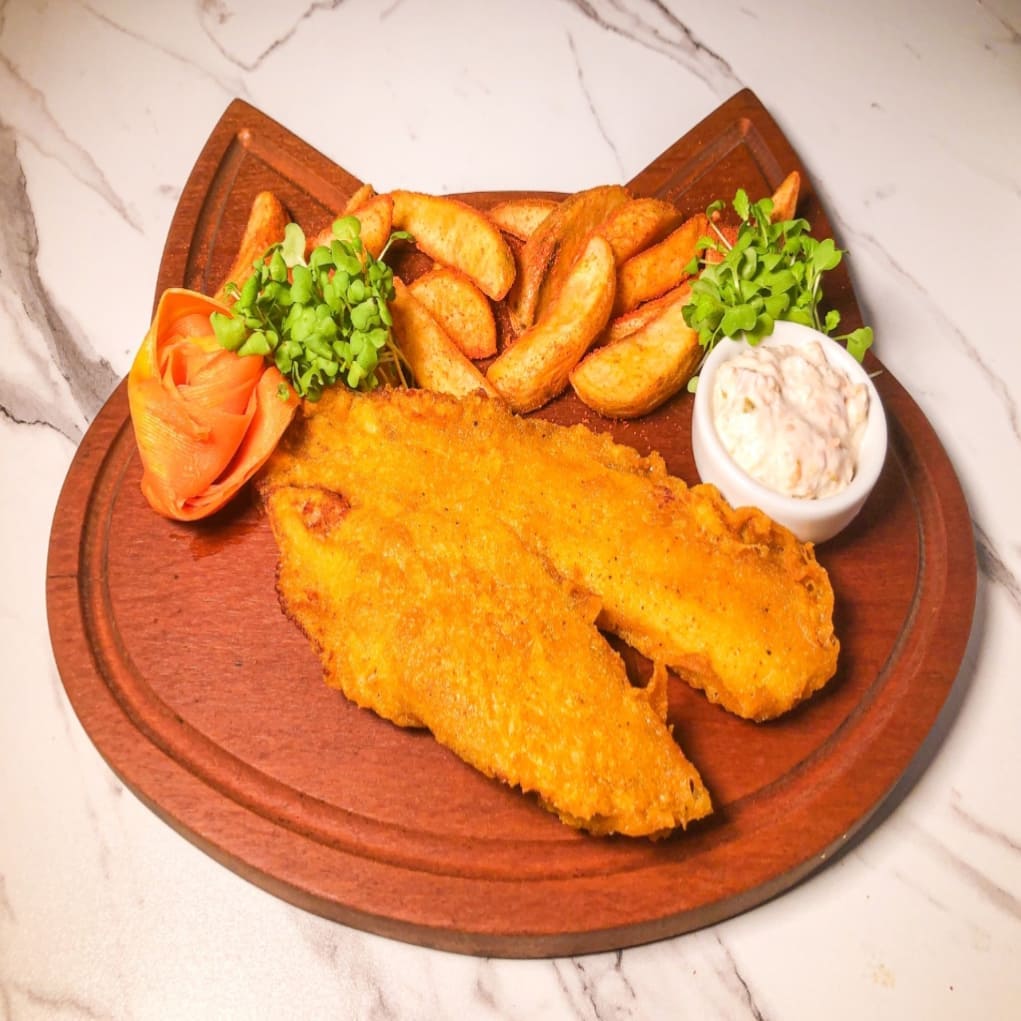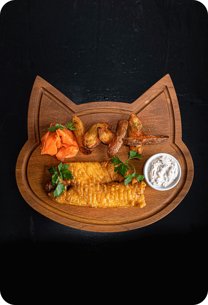 - 🐟 Gato FIsh and Chips - Filé de tilápia feita no tempurá. Acompanha batatas rústicas, molho tártaro e picles de cenoura