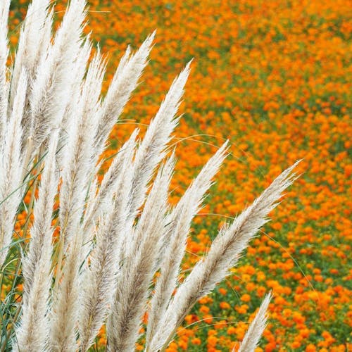As flores do outono: kochia, cosmos laranja, capim dos pampas, cosmos.