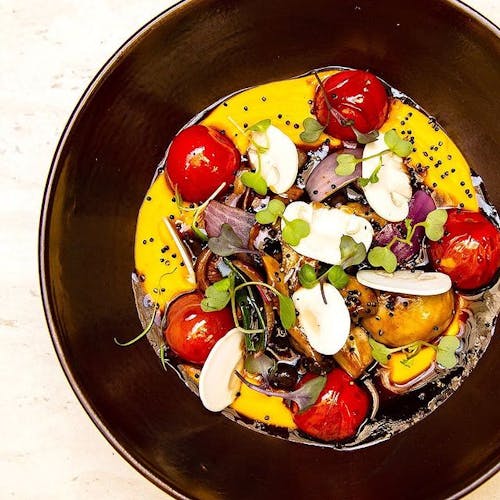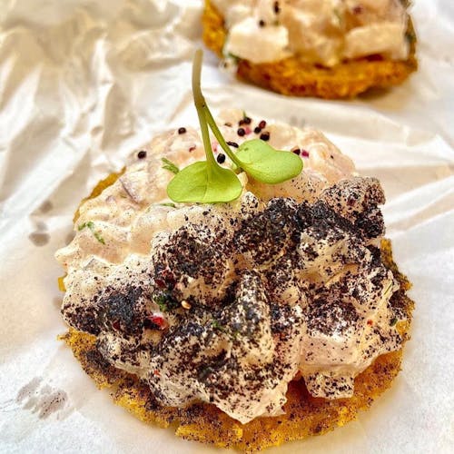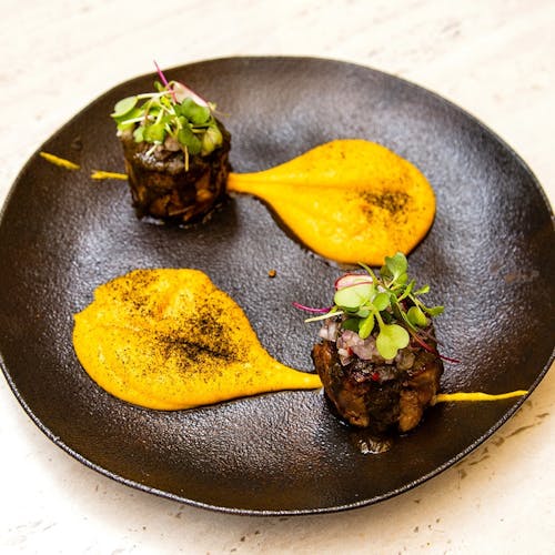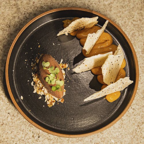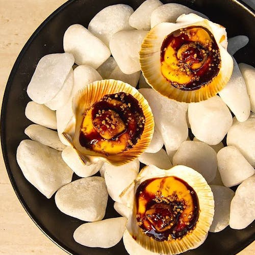 - 🎃. Concha Tucupi: Vieiras em sal e alho , purê do abóbora e mel do tucupi preto