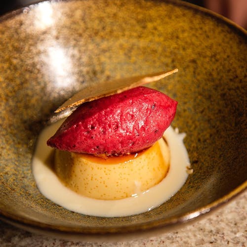 - 🍮. Crema Volteada: Pudim de leite em mel de cacau, creme inglês de cupuaçu, craqueline de castanhas e amora