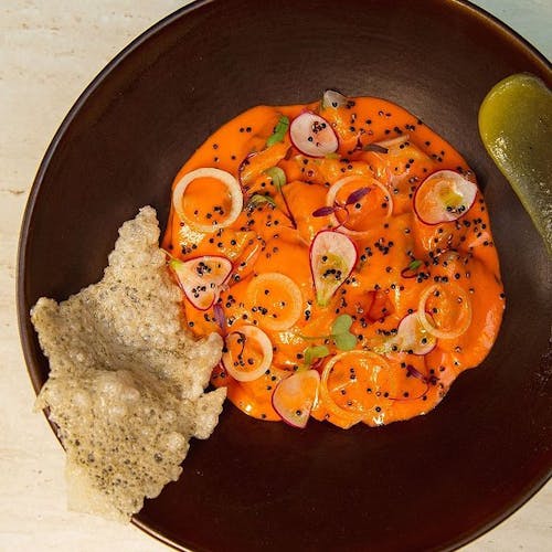 🌱 🍎 O chef Enrique Paredes além de desenvolver os pratos que são sensação do restaurante, também se preocupou em criar opções vegetarianas para incluir no menu alternativas para quem não consome carne. Outro cuidado com o cardápio é escolher frutas que geralmente são comuns nos dois países. Apesar da culinária ser predominante peruana há influências e adaptações de ingredientes brasileiros.