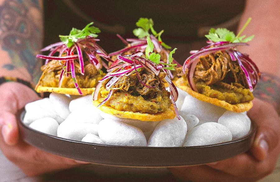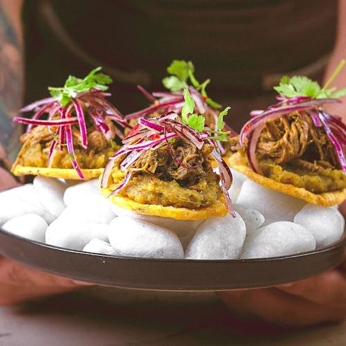 - 🍌 Patacones: Tostadas de banana da terra com lagarto desfiado e purê de mandioca