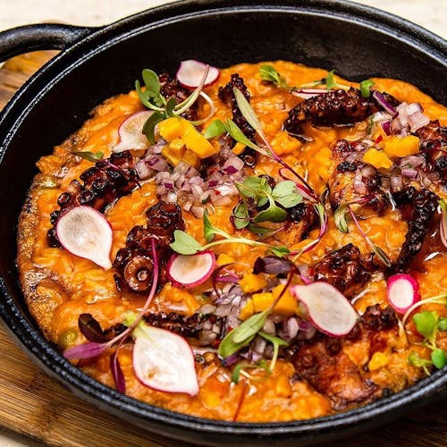 - 🥣. Sopa Seca De Choros: Fideuá cremoso de mexilhões com leve crosta por baixo, chalaquita e aioli de pimenta