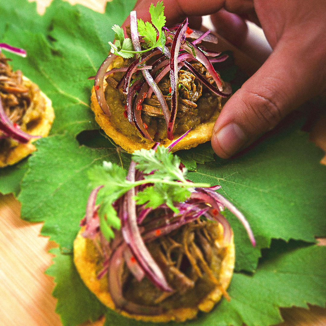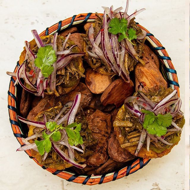 - 🍌 Patacones: Tostadas de banana da terra com lagarto desfiado e purê de mandioca