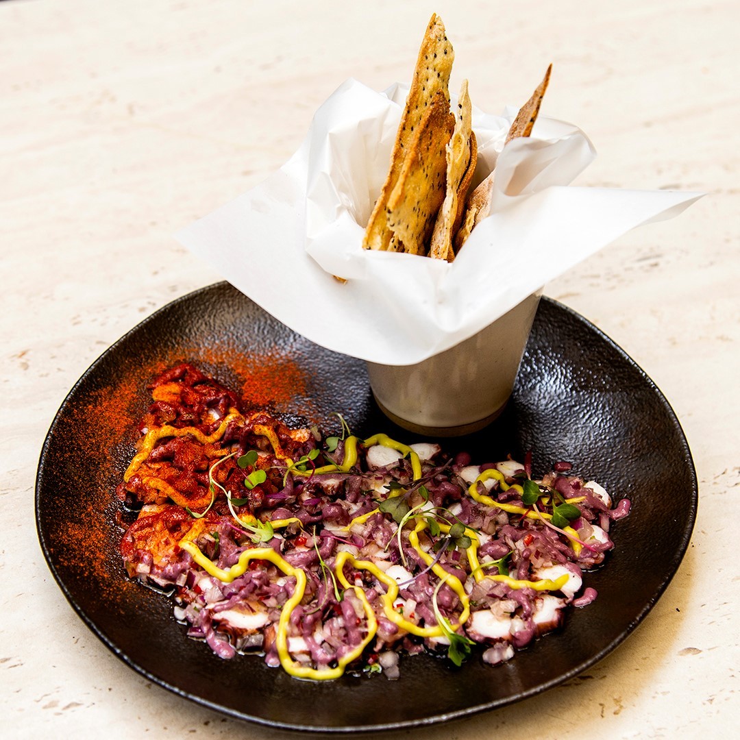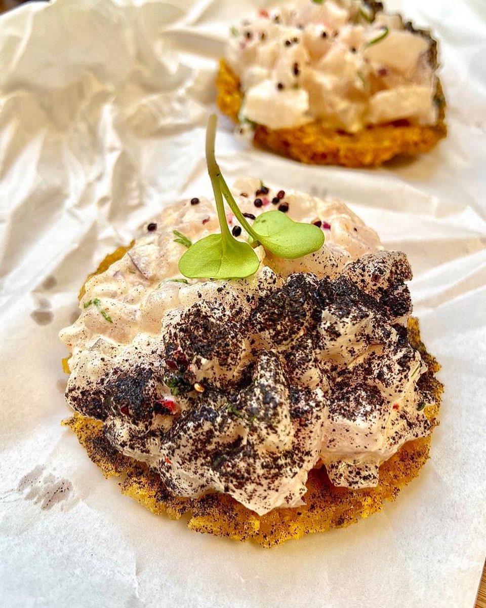 - 🌮 Tacos de milho crocante, tartare de pesca do dia e guacamole