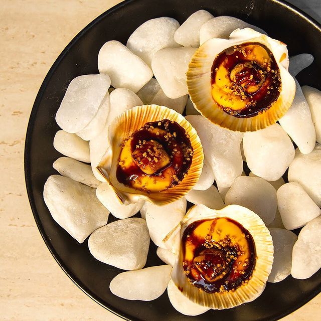 - 🎃. Concha Tucupi: Vieiras em sal e alho , purê do abóbora e mel do tucupi preto