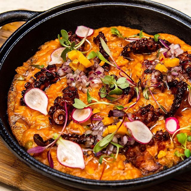 - 🦐. Quinoto a la Huancaína: Quinoa, creme à base de queijo e camarões flambados em parrilla