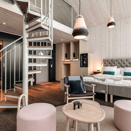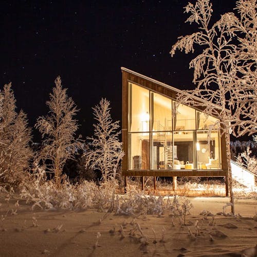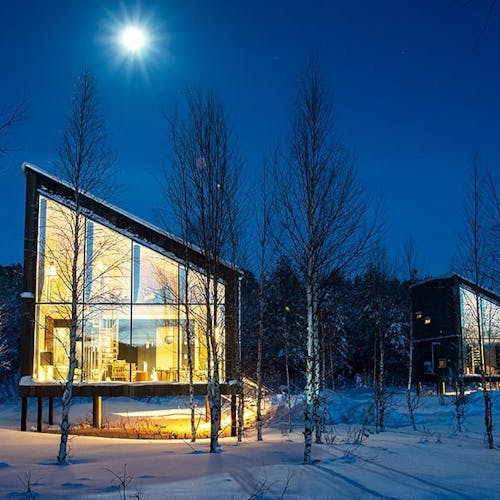 No inverno os hóspedes têm o privilégio de ver a aurora boreau do próprio quarto e no verão podem ter a experiência de mergulhar com o sol da meia-noite.