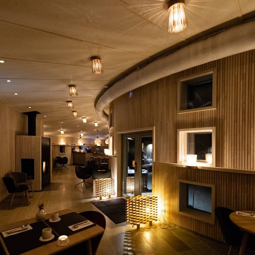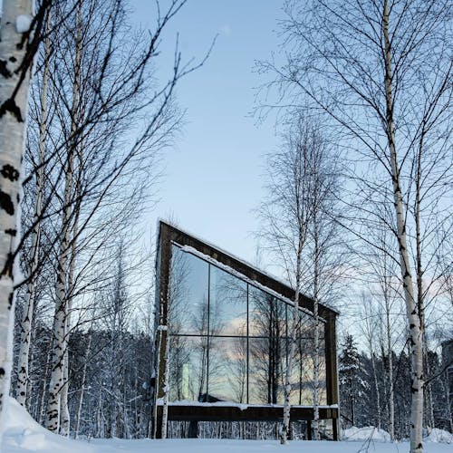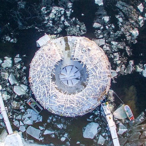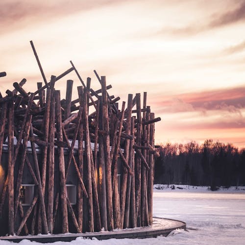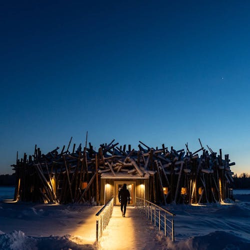 Com a construção de madeira e parte dele com diversos pedaços que lembram gravetos, ele foi projetado para parecer um aglomerado de madeira encravada no rio. Outra experiência do local é que logo no centro do hotel, ao redor do círculo de madeira é possível tomar o banho ártico gelado - você teria coragem?