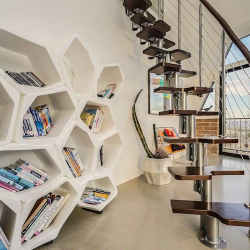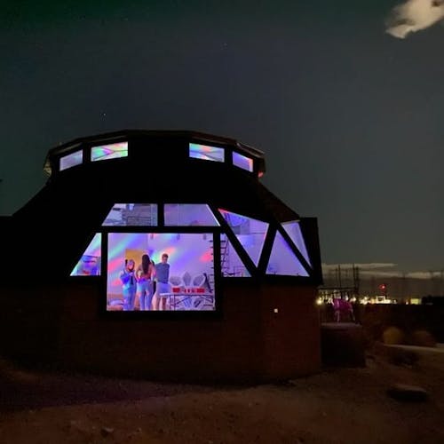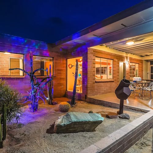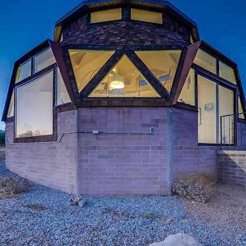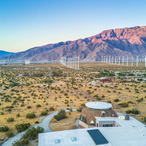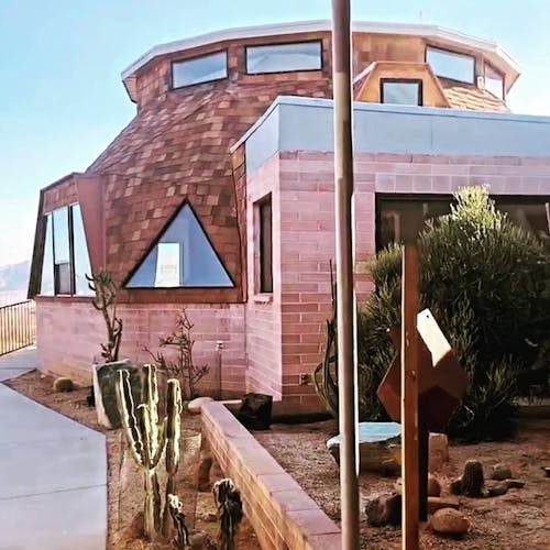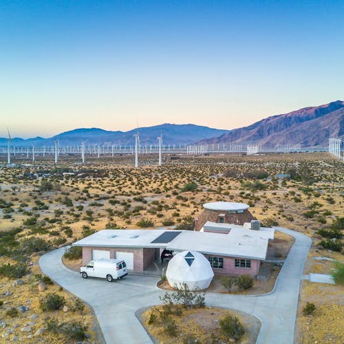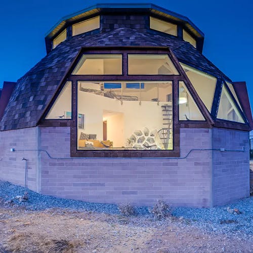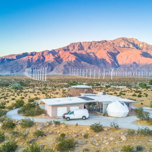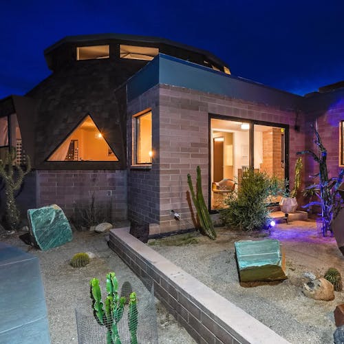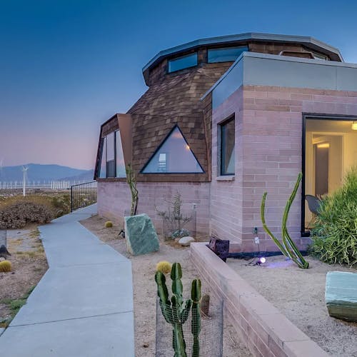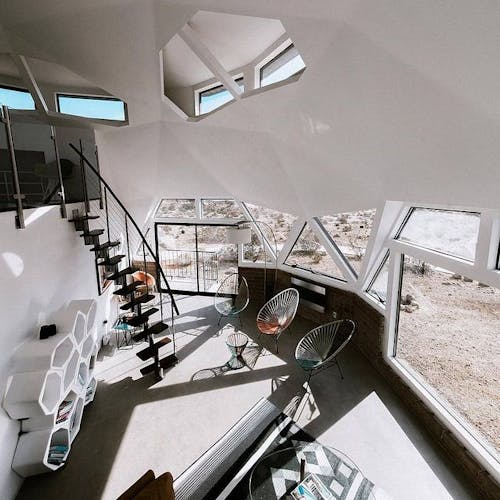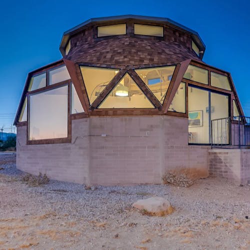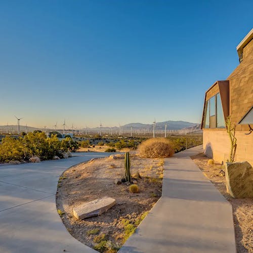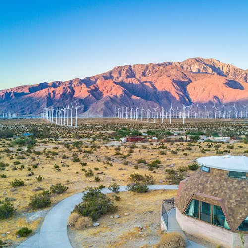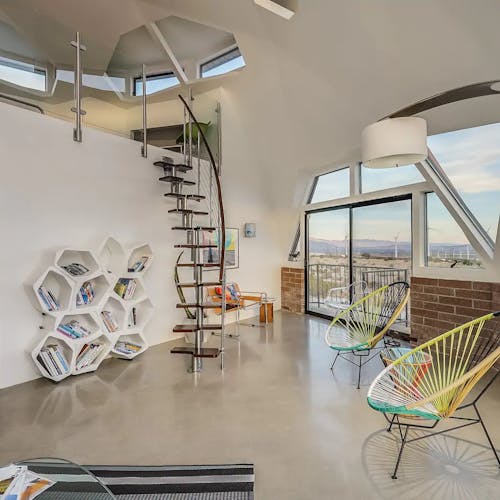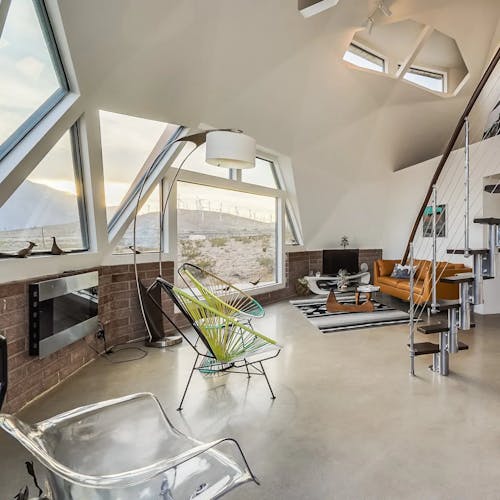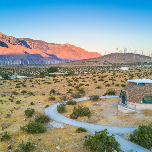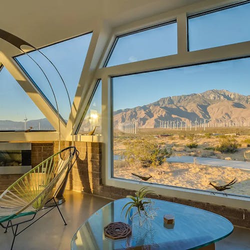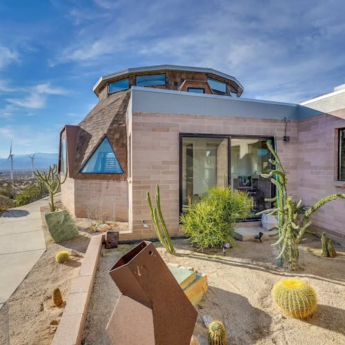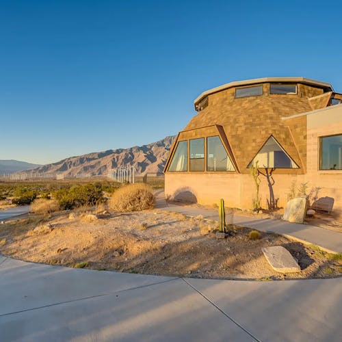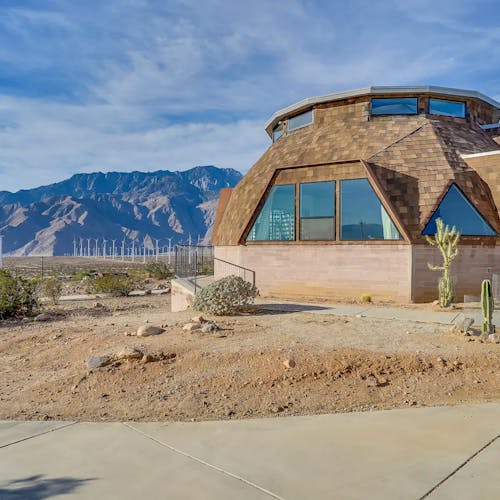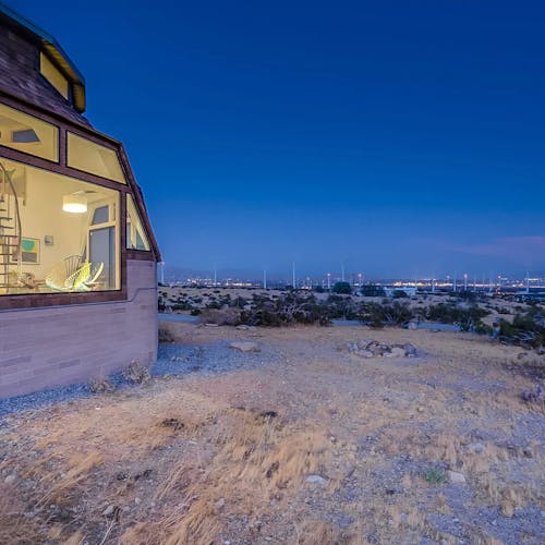 A Palm Springs Dome Home como é chamada a propriedade, é uma casa privativa que pode ser alugada pelo Airbnb (link abaixo das fotos). A arquitetura se mistura entre uma construção irregular e uma cúpula geodésica com vista 360 graus do deserto e montanhas da região de Palm Springs na Califórnia. Ao redor da propriedade, muitos moinhos de vento trazem uma atmosfera totalmente diferente e inusitada, com um visual realmente especial do Coachella Valley e as luzes da cidade de Palm Springs.