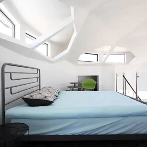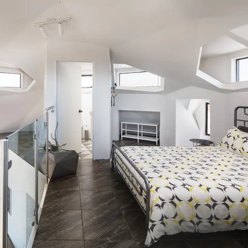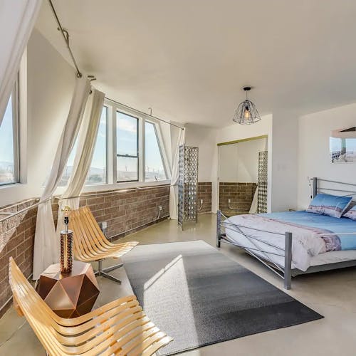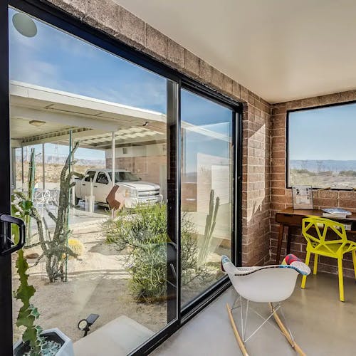 O quarto principal no piso térreo oferece uma vista incrível das montanhas do Parque Nacional Joshua Tree e da paisagem do deserto. Também há uma ampla área de estar para leitura e contemplação privada da suíte.