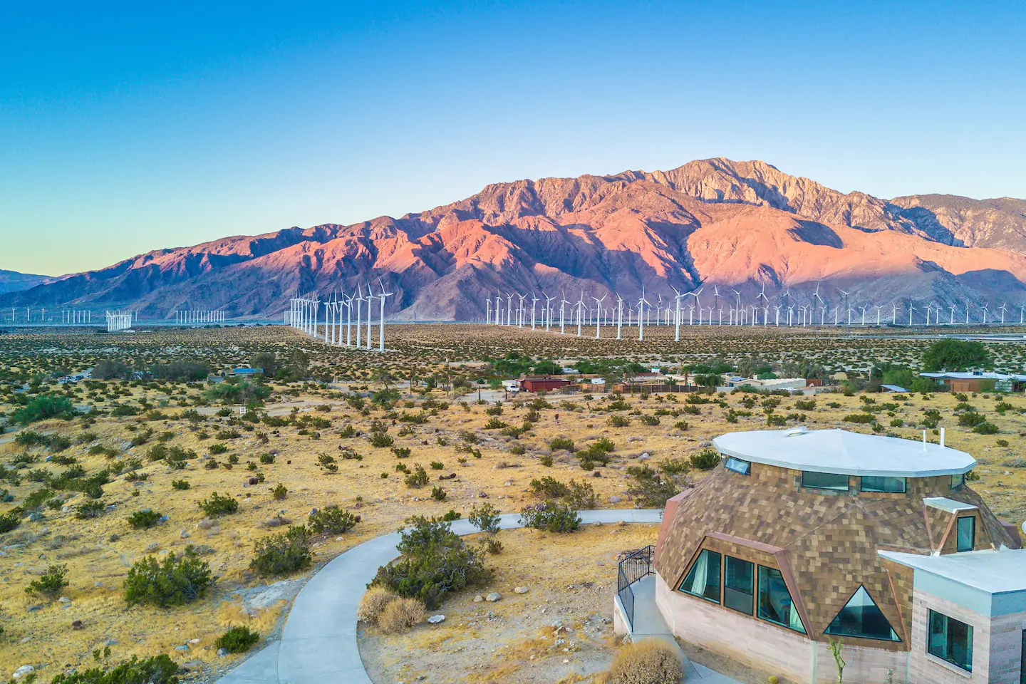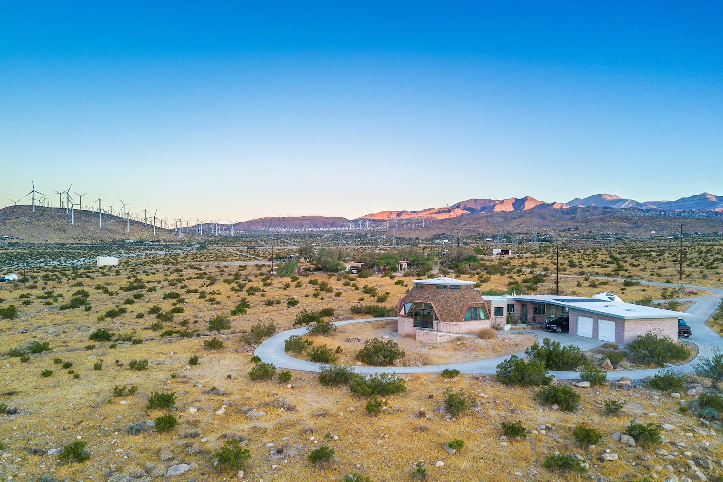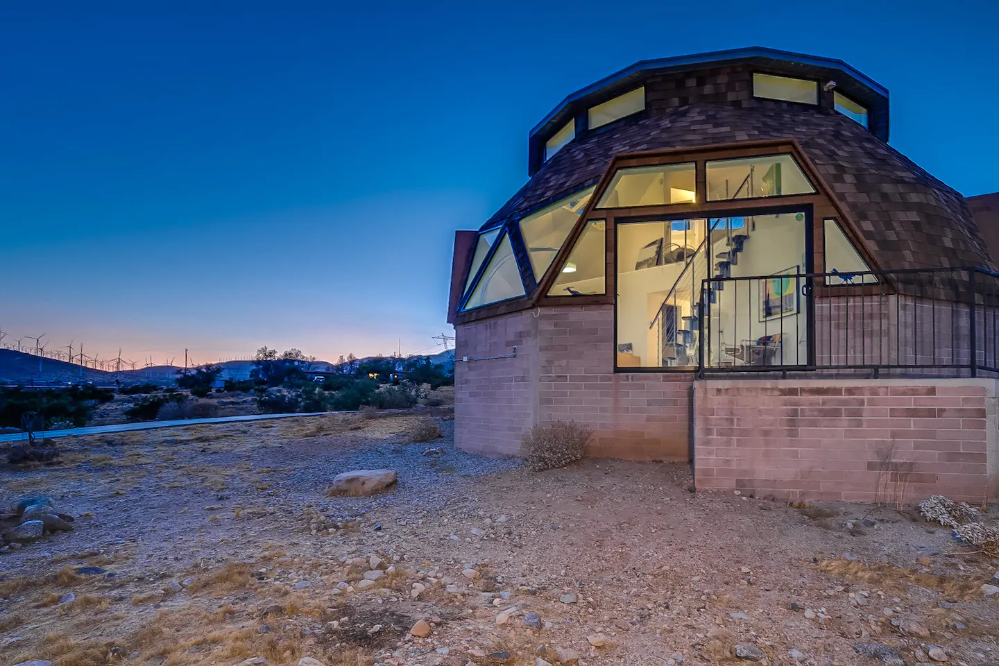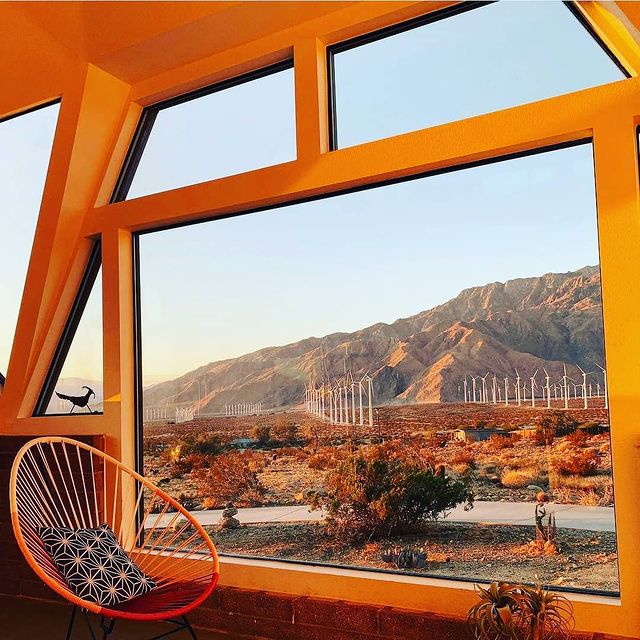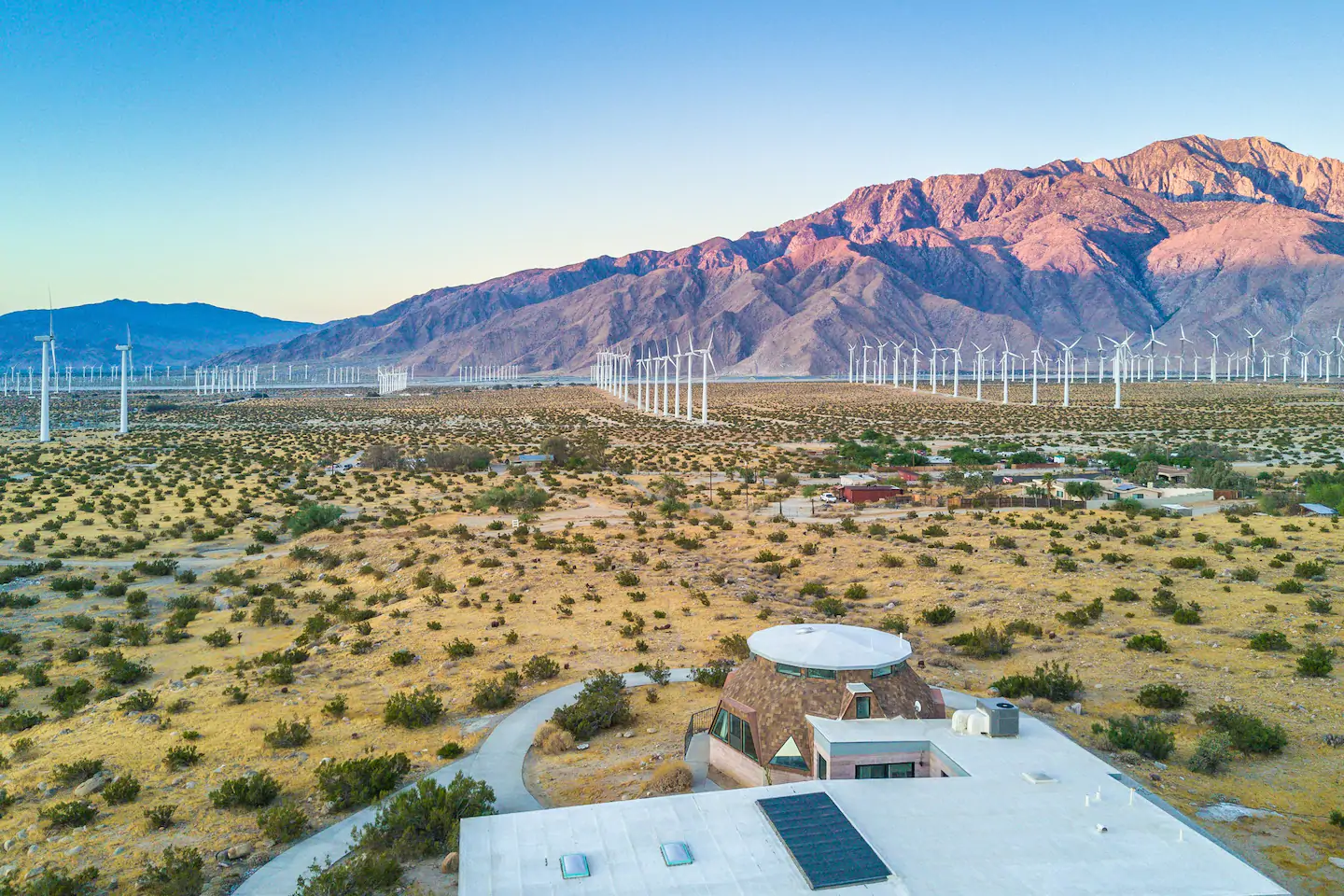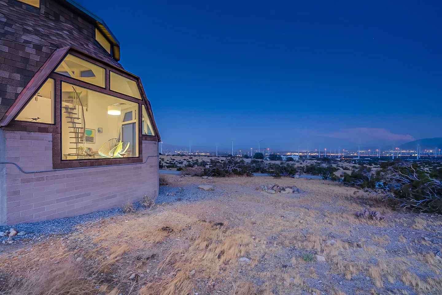 A Palm Springs Dome Home como é chamada a propriedade, é uma casa privativa que pode ser alugada pelo Airbnb (link abaixo das fotos). A arquitetura se mistura entre uma construção irregular e uma cúpula geodésica com vista 360 graus do deserto e montanhas da região de Palm Springs na Califórnia. Ao redor da propriedade, muitos moinhos de vento trazem uma atmosfera totalmente diferente e inusitada, com um visual realmente especial do Coachella Valley e as luzes da cidade de Palm Springs.