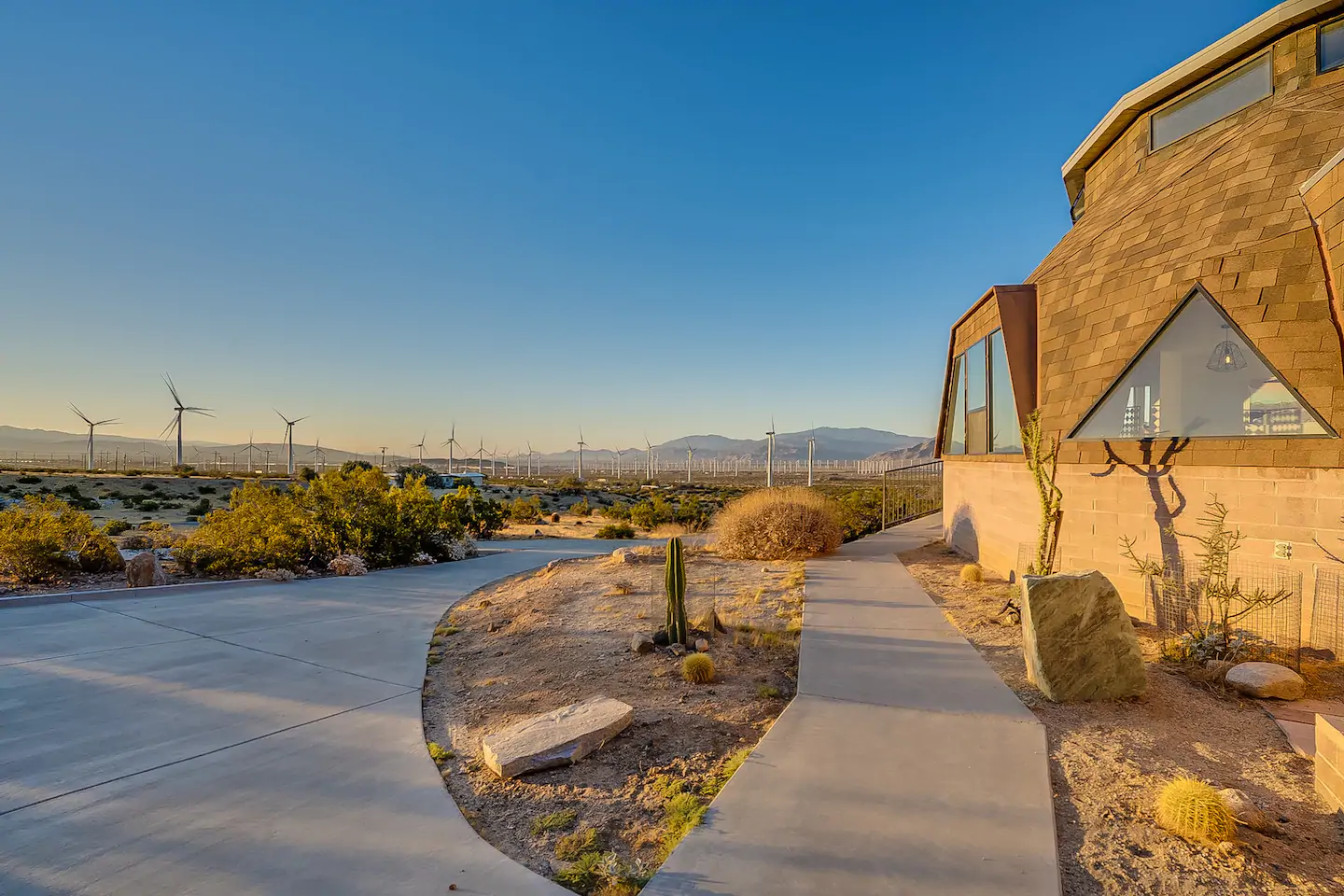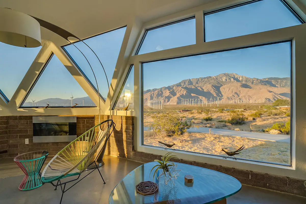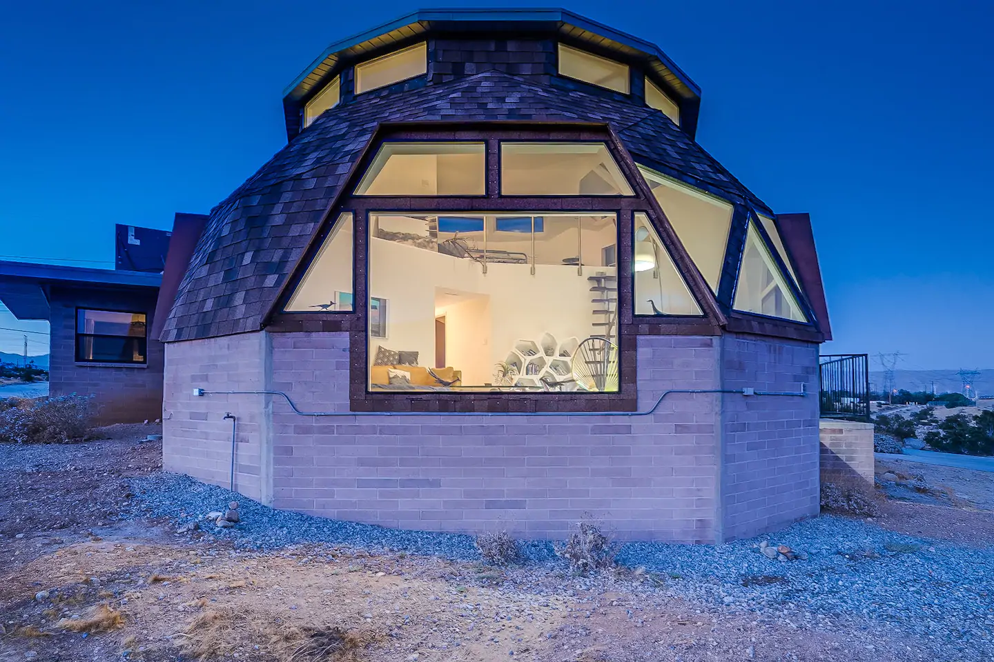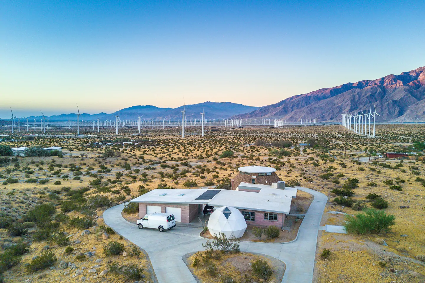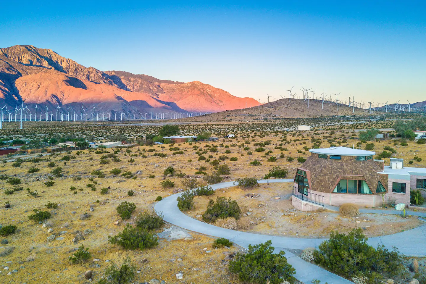 A Palm Springs Dome Home como é chamada a propriedade, é uma casa privativa que pode ser alugada pelo Airbnb (link abaixo das fotos). A arquitetura se mistura entre uma construção irregular e uma cúpula geodésica com vista 360 graus do deserto e montanhas da região de Palm Springs na Califórnia. Ao redor da propriedade, muitos moinhos de vento trazem uma atmosfera totalmente diferente e inusitada, com um visual realmente especial do Coachella Valley e as luzes da cidade de Palm Springs.