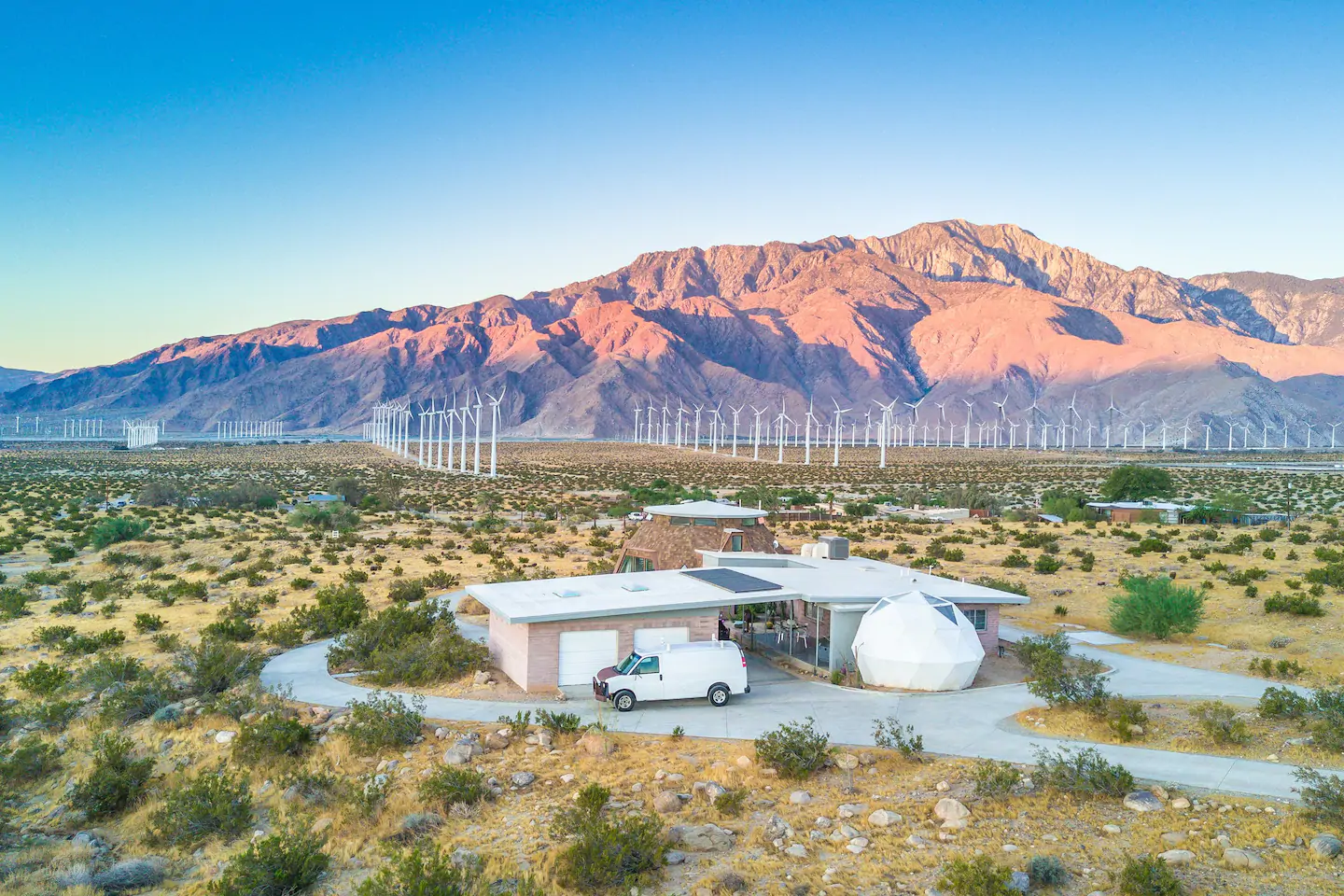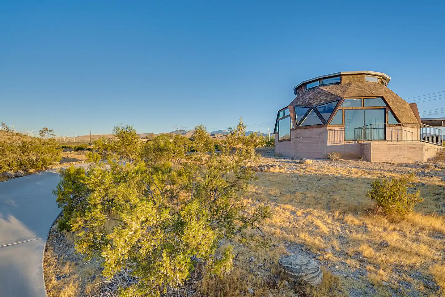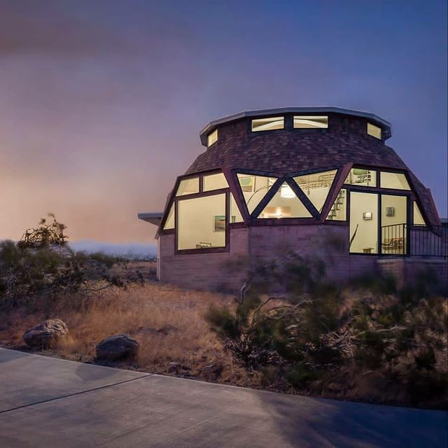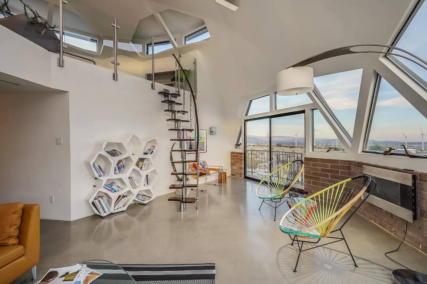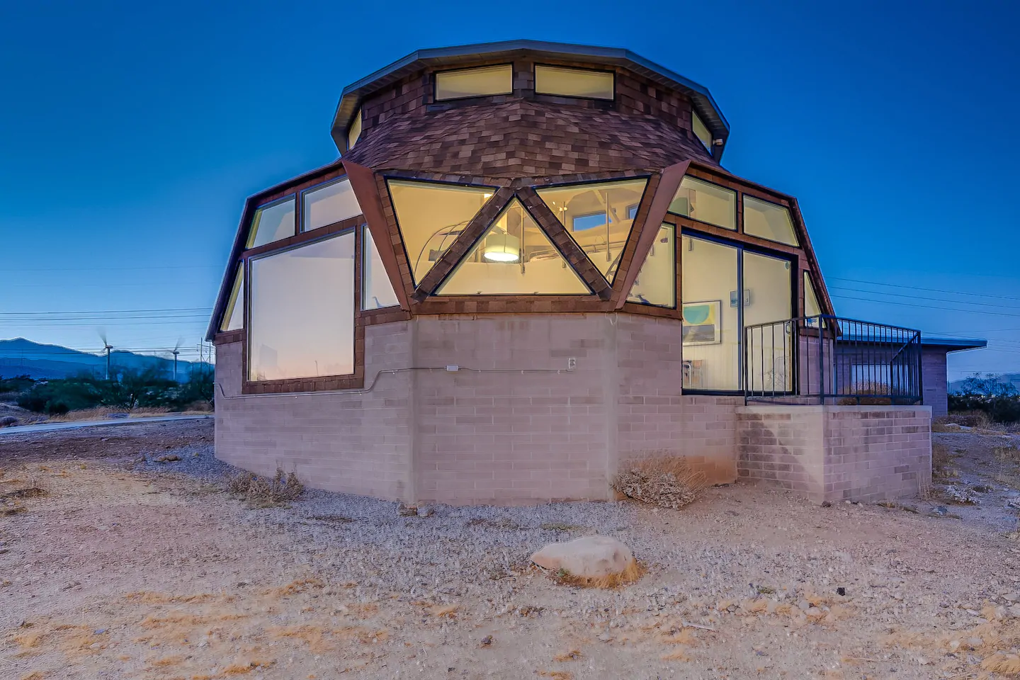 A Palm Springs Dome Home como é chamada a propriedade, é uma casa privativa que pode ser alugada pelo Airbnb (link abaixo das fotos). A arquitetura se mistura entre uma construção irregular e uma cúpula geodésica com vista 360 graus do deserto e montanhas da região de Palm Springs na Califórnia. Ao redor da propriedade, muitos moinhos de vento trazem uma atmosfera totalmente diferente e inusitada, com um visual realmente especial do Coachella Valley e as luzes da cidade de Palm Springs.