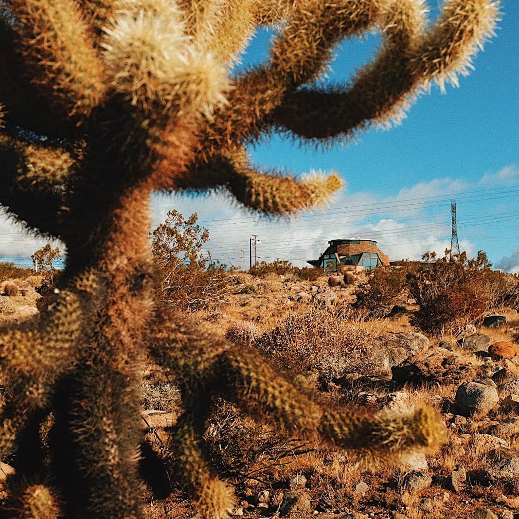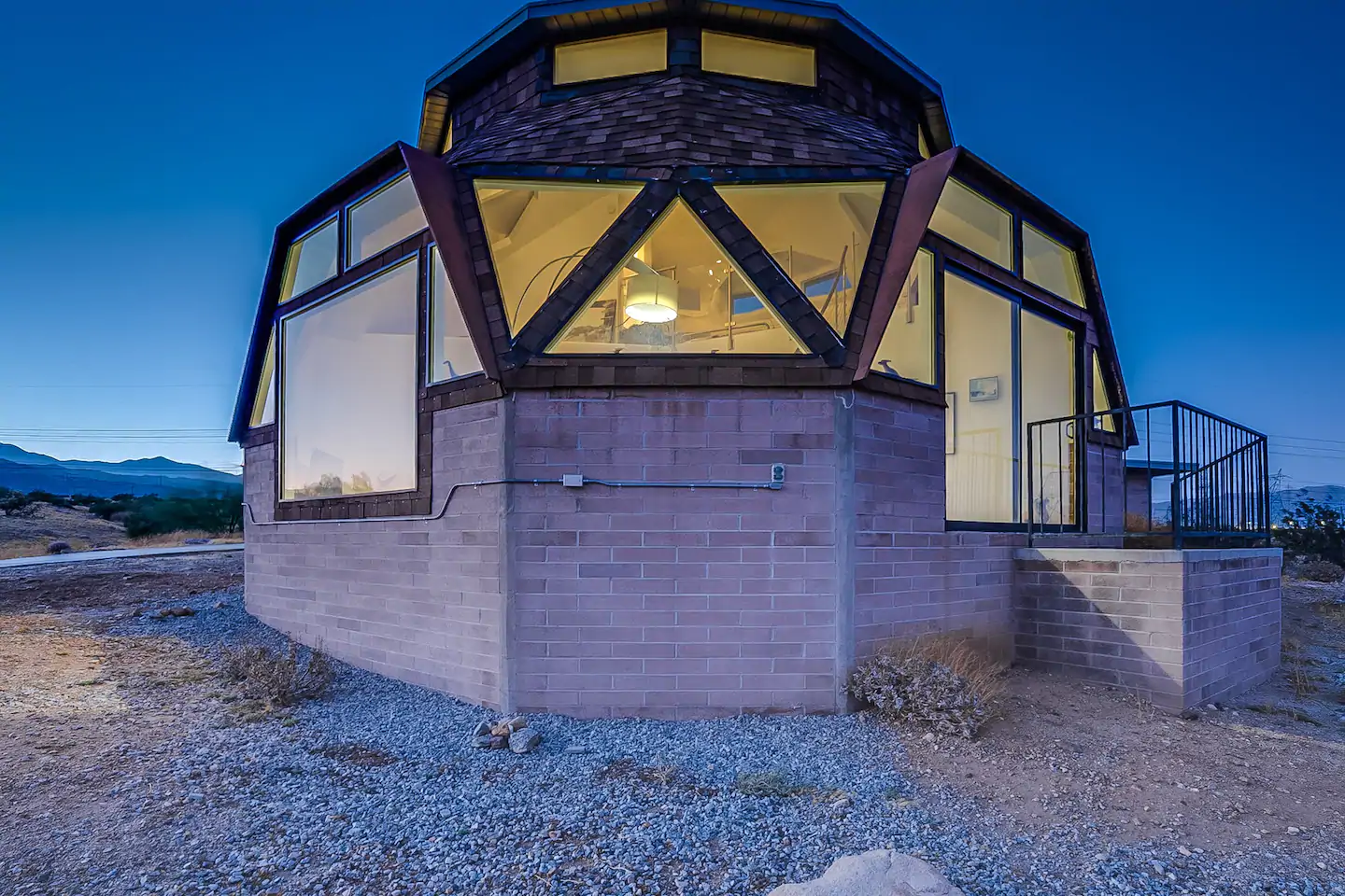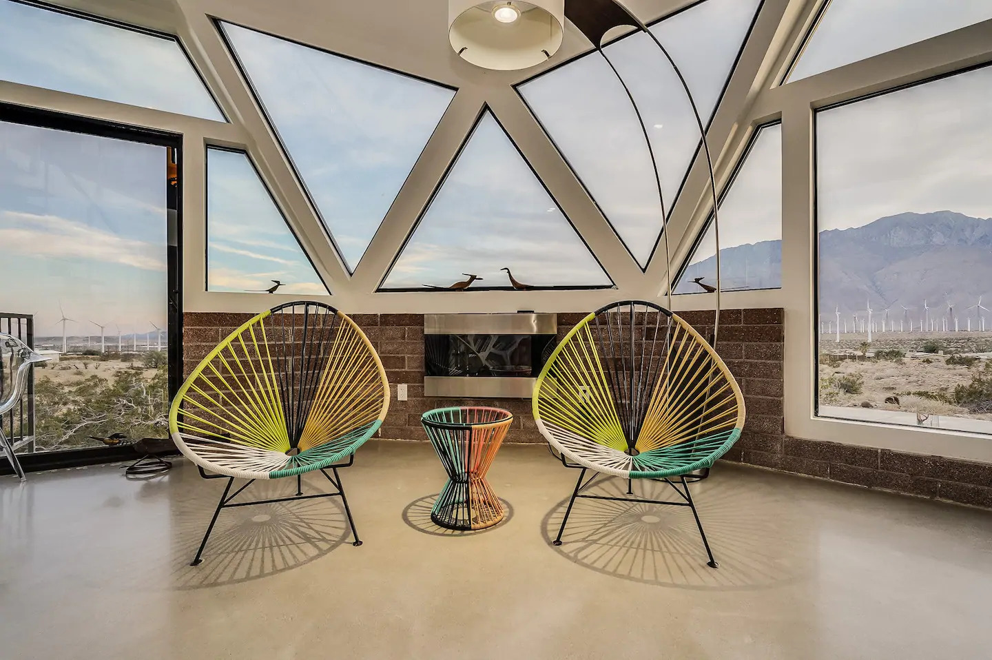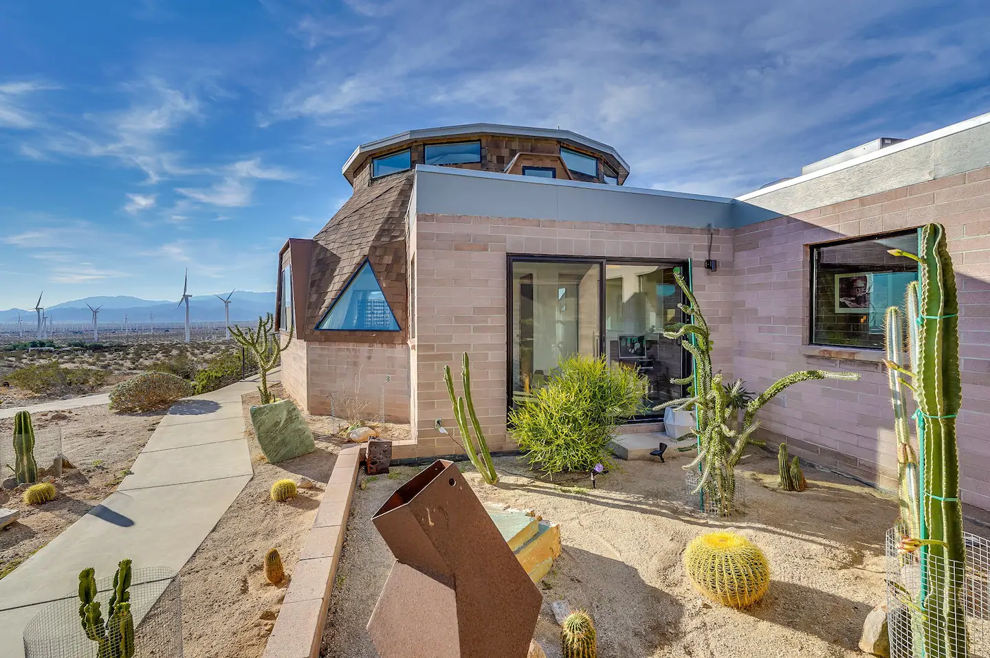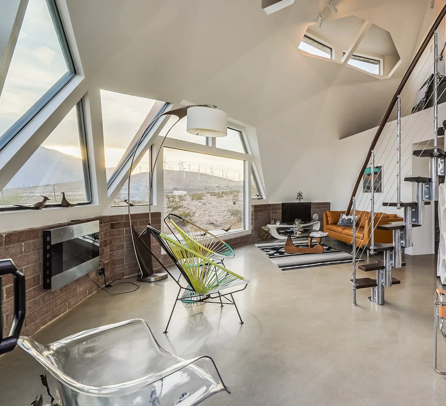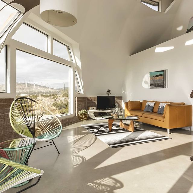 A Palm Springs Dome Home como é chamada a propriedade, é uma casa privativa que pode ser alugada pelo Airbnb (link abaixo das fotos). A arquitetura se mistura entre uma construção irregular e uma cúpula geodésica com vista 360 graus do deserto e montanhas da região de Palm Springs na Califórnia. Ao redor da propriedade, muitos moinhos de vento trazem uma atmosfera totalmente diferente e inusitada, com um visual realmente especial do Coachella Valley e as luzes da cidade de Palm Springs.