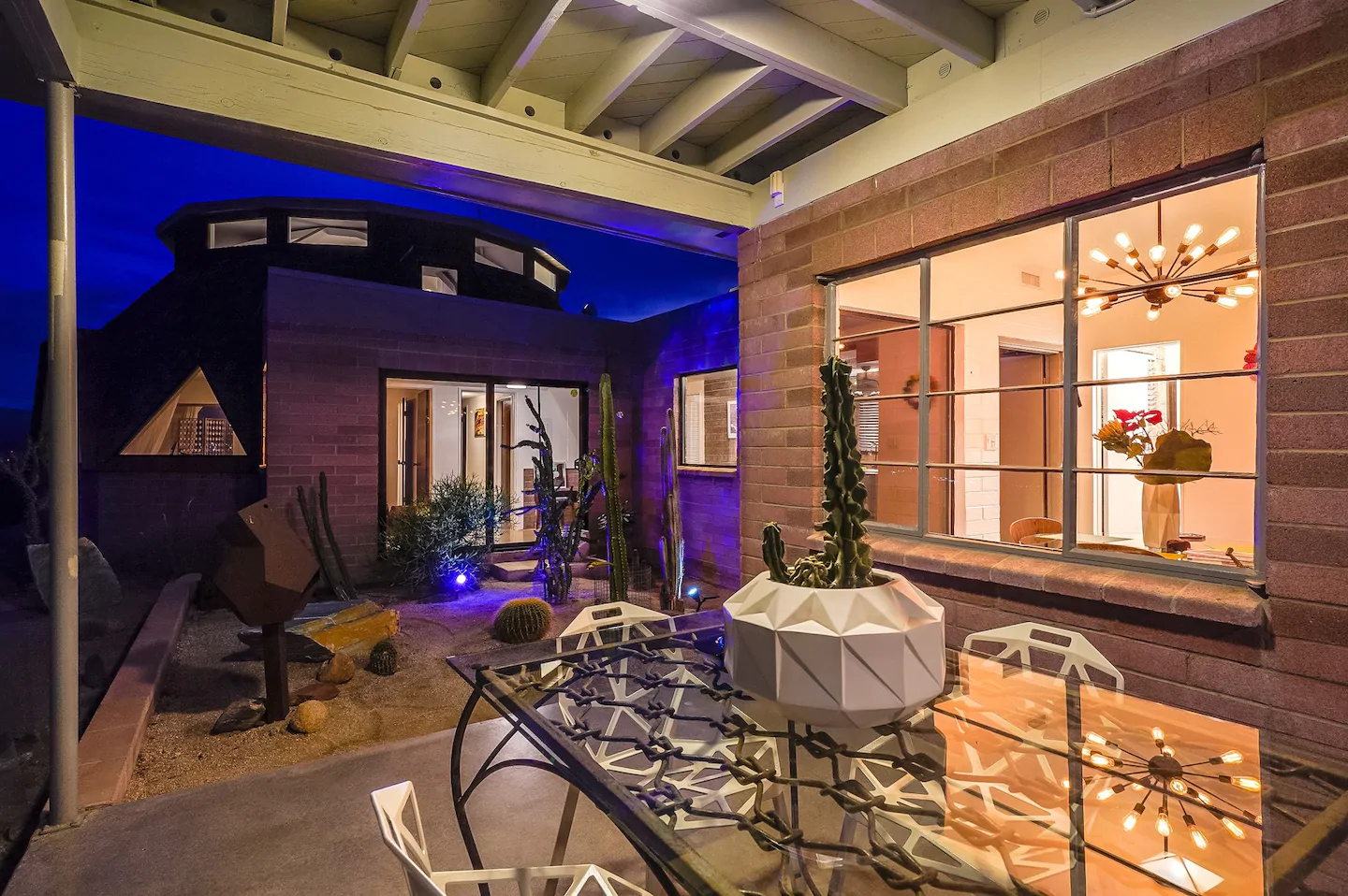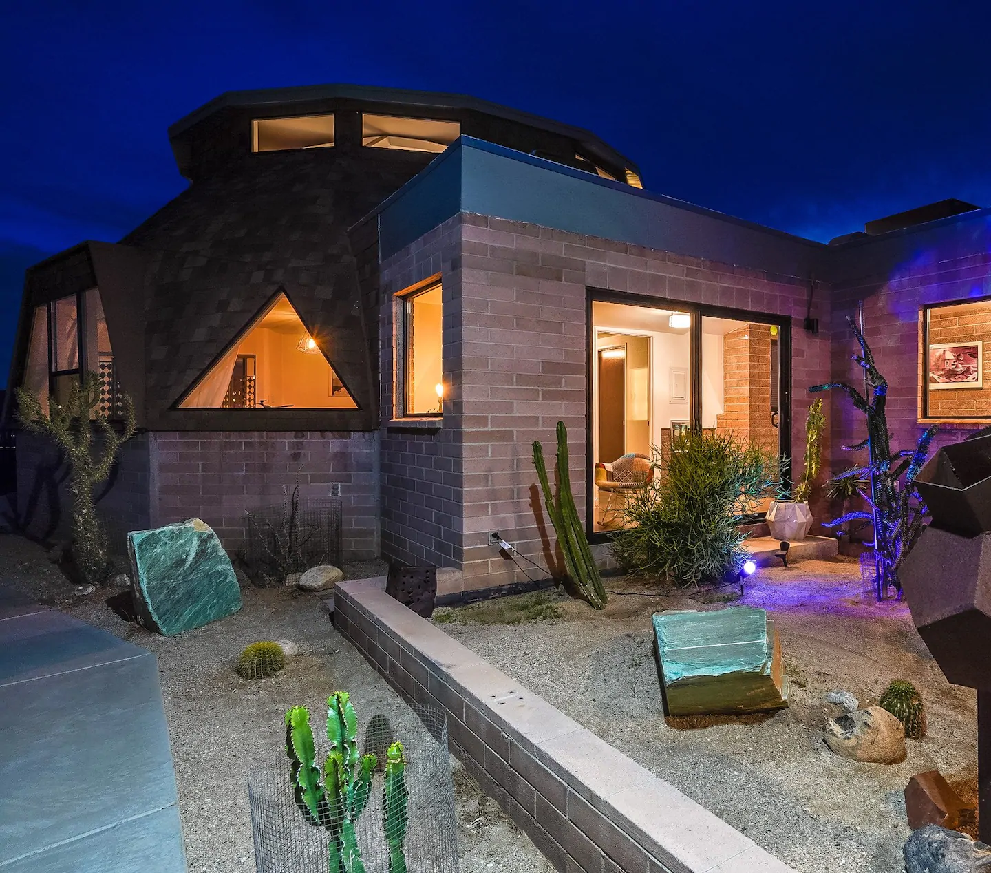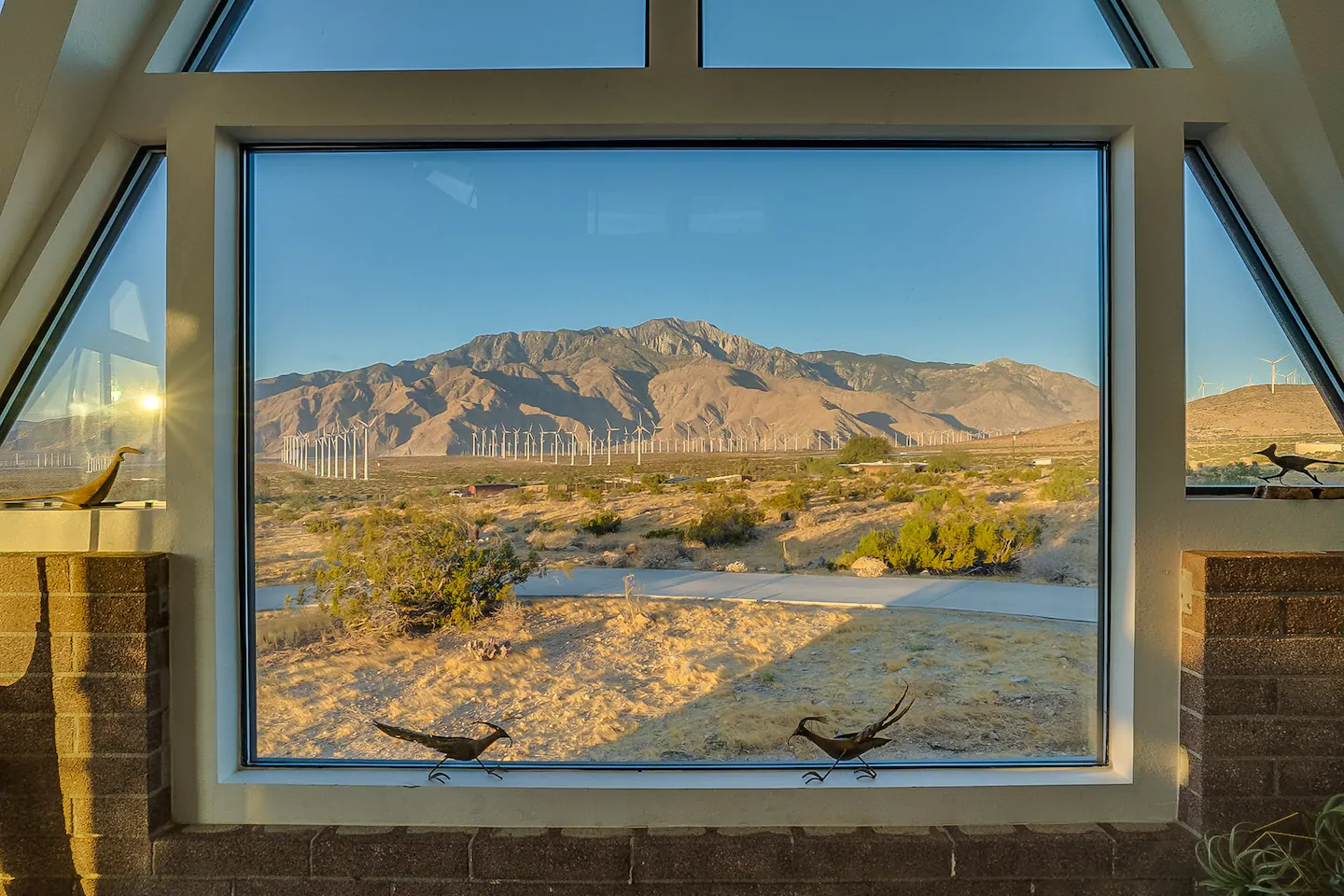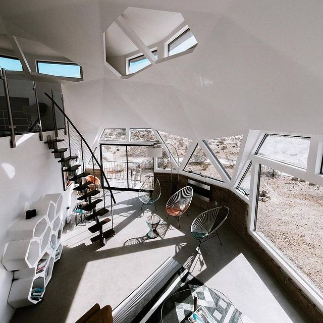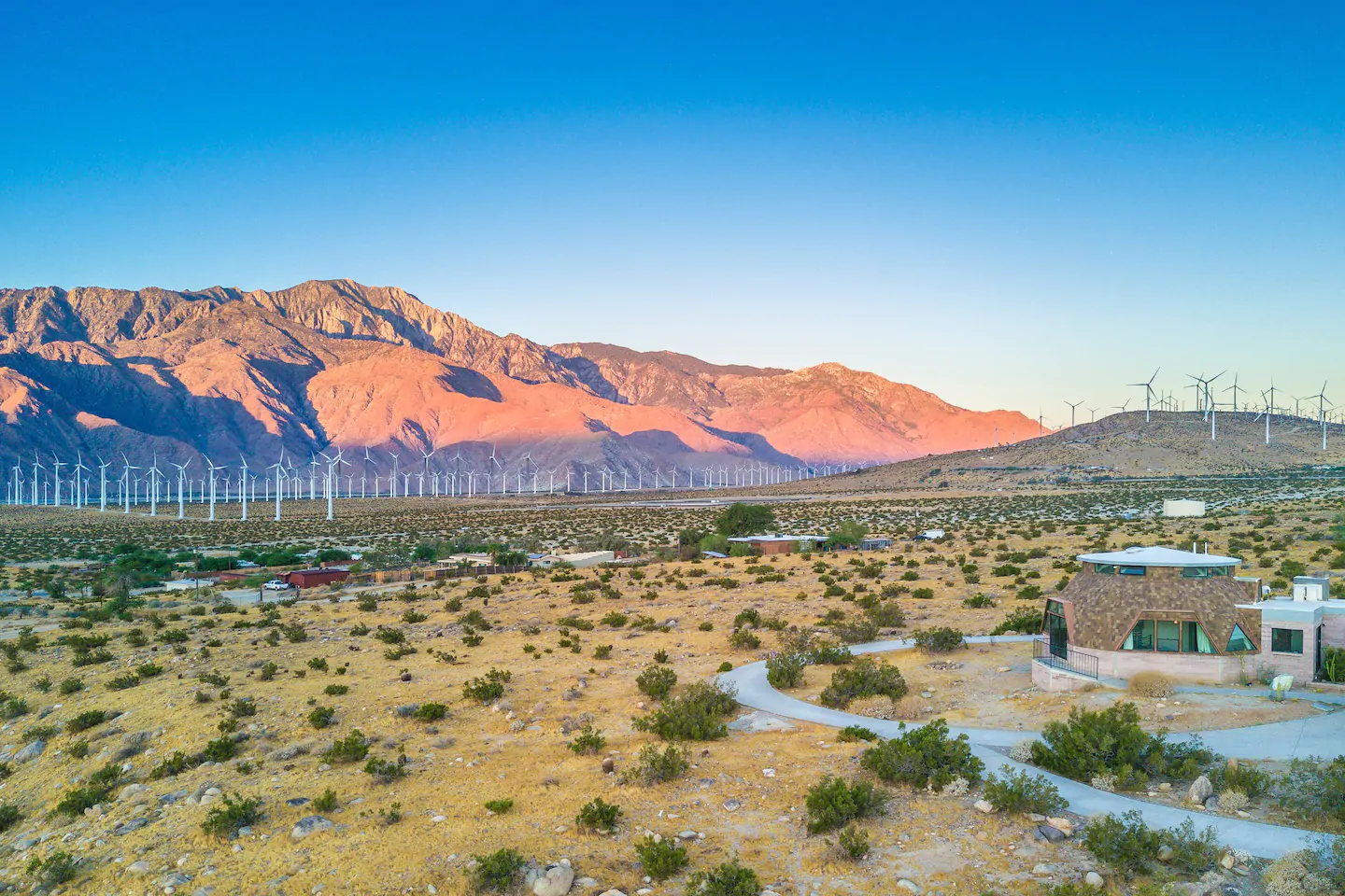 A Palm Springs Dome Home como é chamada a propriedade, é uma casa privativa que pode ser alugada pelo Airbnb (link abaixo das fotos). A arquitetura se mistura entre uma construção irregular e uma cúpula geodésica com vista 360 graus do deserto e montanhas da região de Palm Springs na Califórnia. Ao redor da propriedade, muitos moinhos de vento trazem uma atmosfera totalmente diferente e inusitada, com um visual realmente especial do Coachella Valley e as luzes da cidade de Palm Springs.