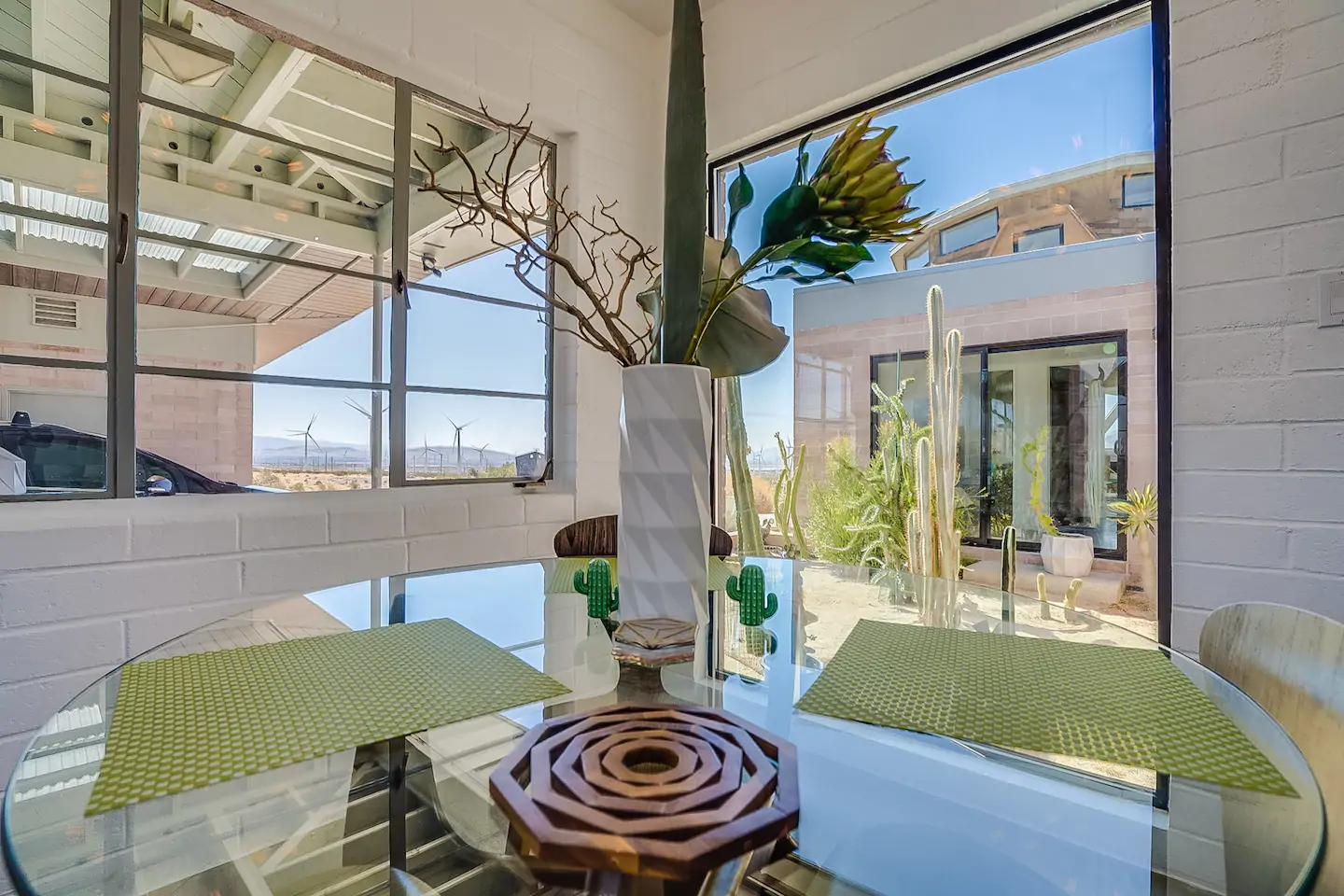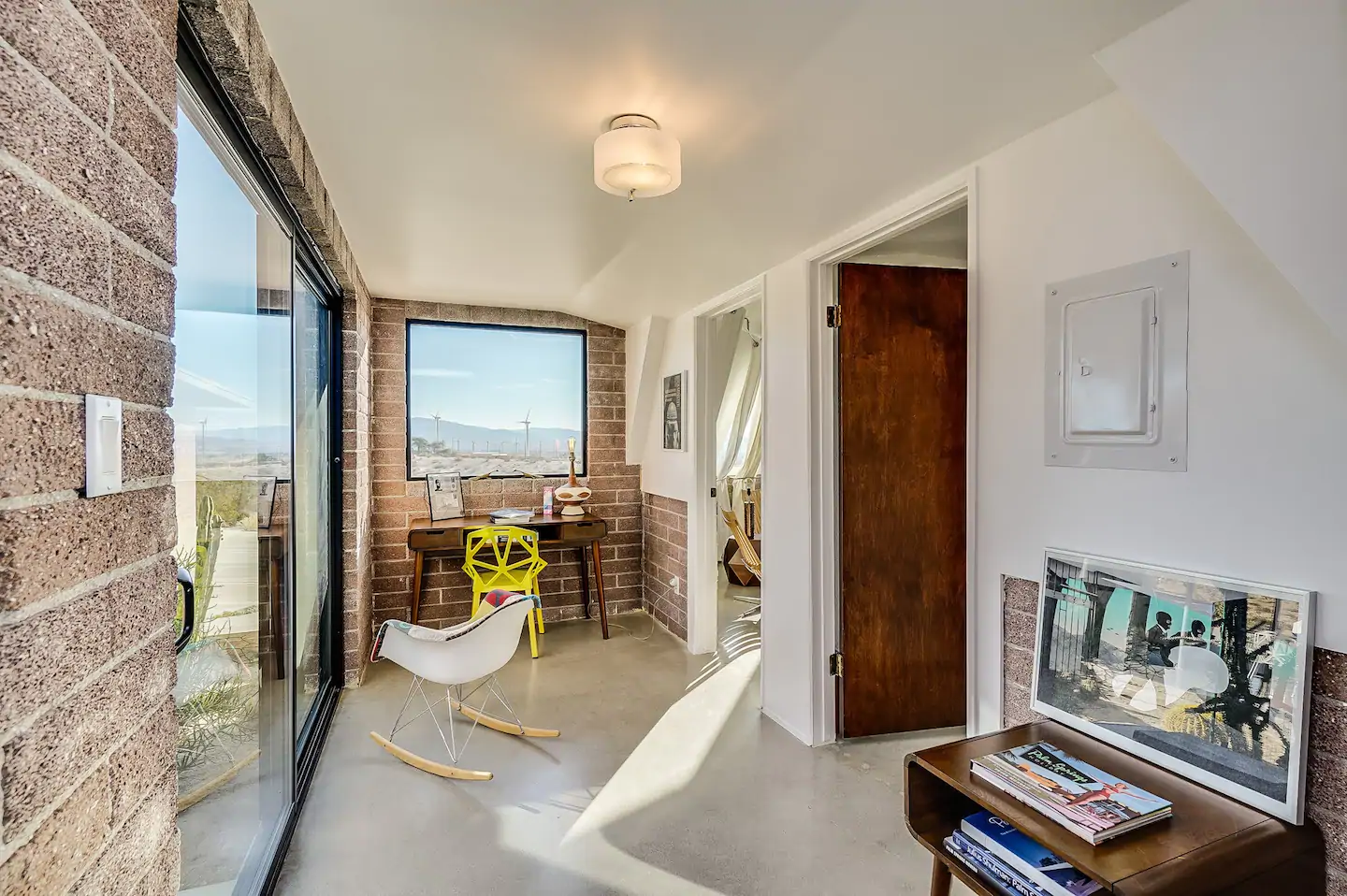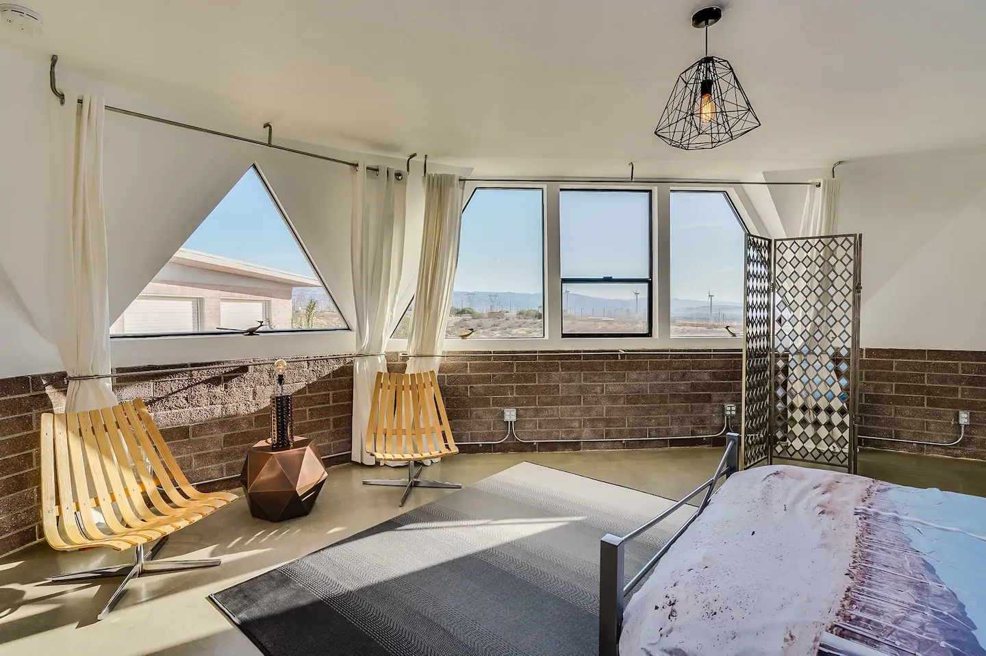 Acorde com o nascer do sol sobre o Parque Nacional Joshua Tree e o Coachella Valley e aprecie o pôr do sol na cúpula da sala de estar com vistas panorâmicas da cordilheira San Jacinto. À noite, veja as estrelas pelas clarabóias da casa e janelas no teto e laterais do quarto do mezanino, tudo isso com total privacidade já que a casa é a única construção por ali.