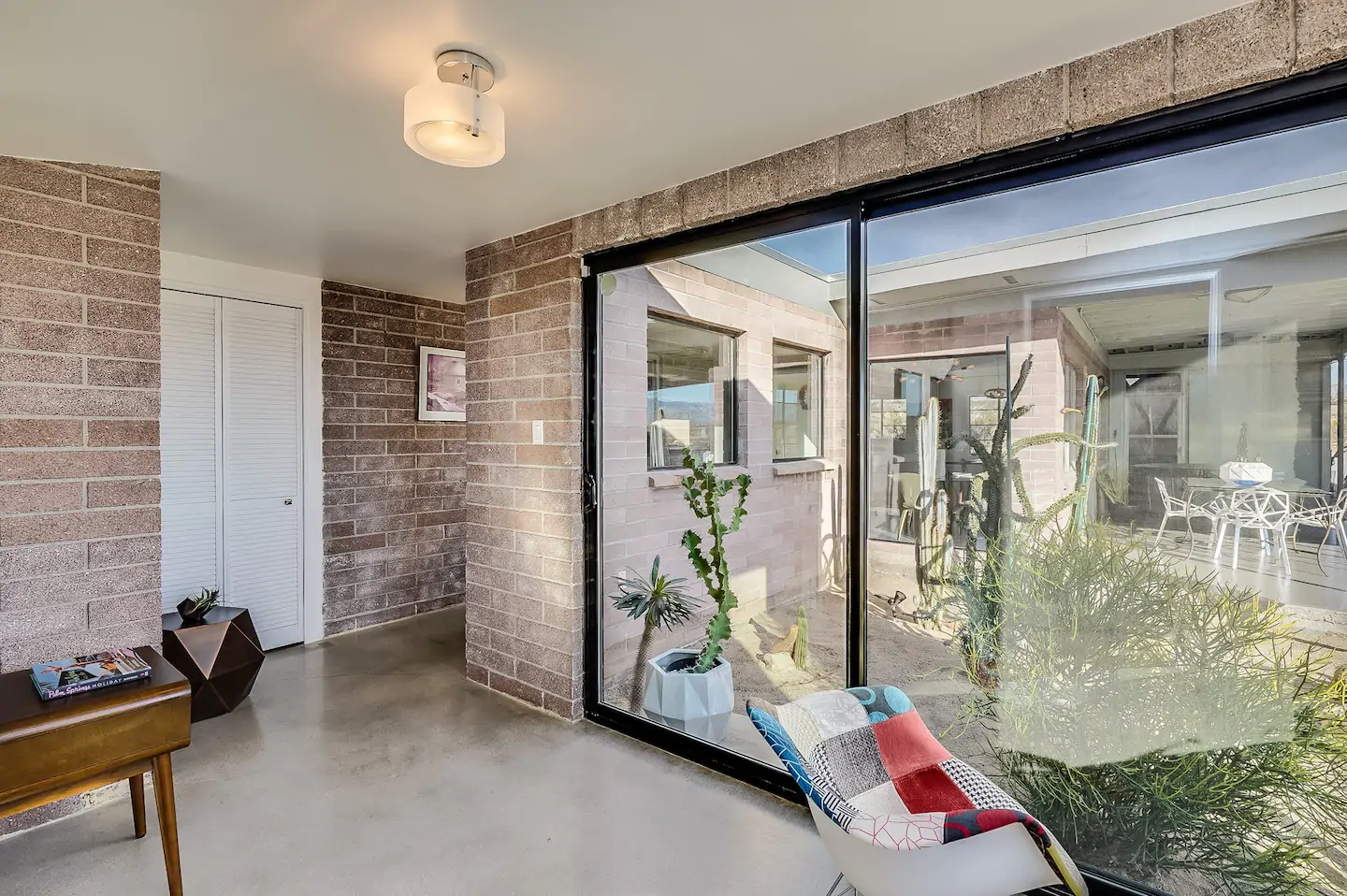 O quarto principal no piso térreo oferece uma vista incrível das montanhas do Parque Nacional Joshua Tree e da paisagem do deserto. Também há uma ampla área de estar para leitura e contemplação privada da suíte.