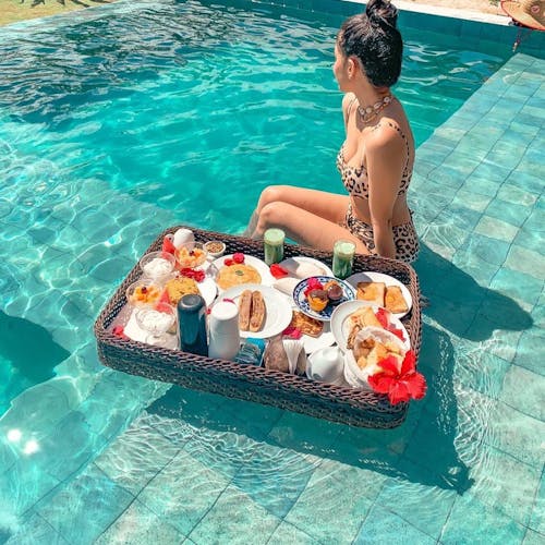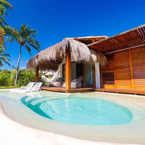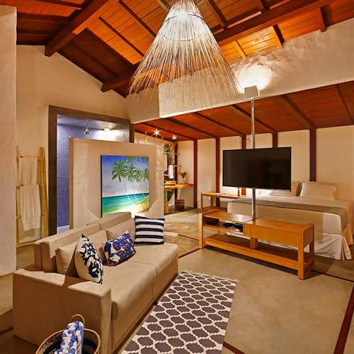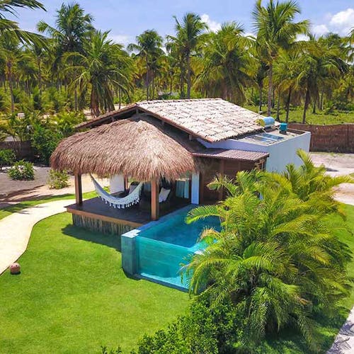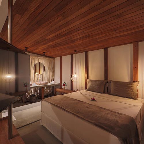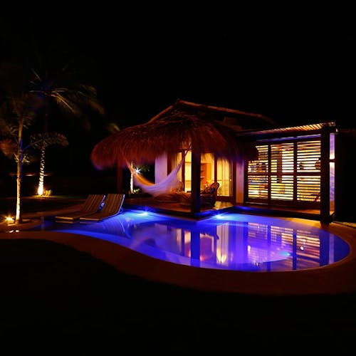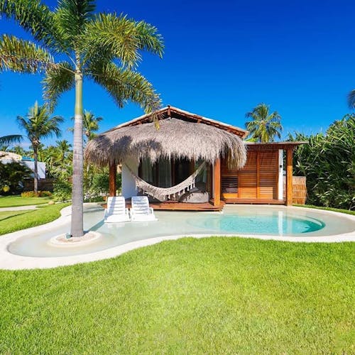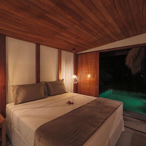A hospedagem complementa a experiência, ainda mais com um bangalô bacanérrimo de piscina privativa, você sai da sua cabana e já cai na água. Quer mais? Que tal tomar seu café da manhã dentro da sua piscina? Ele chega em uma bela bandeja aquática. :)