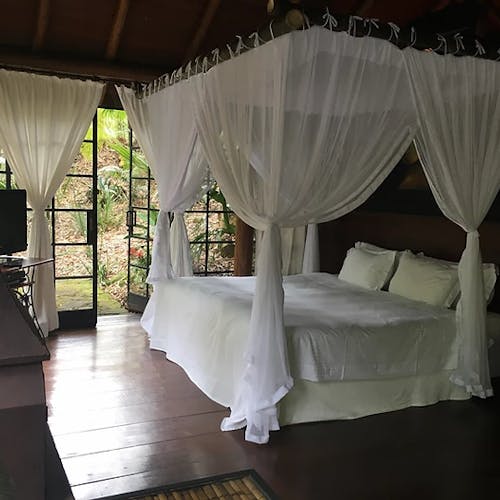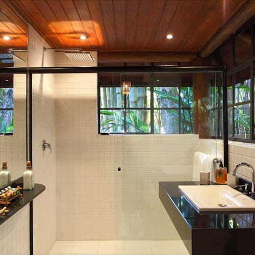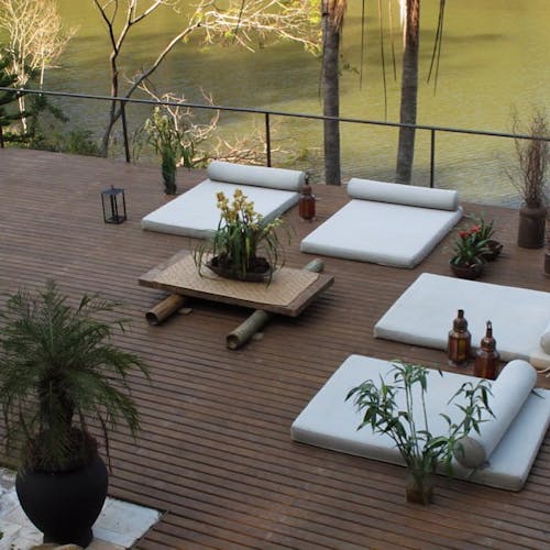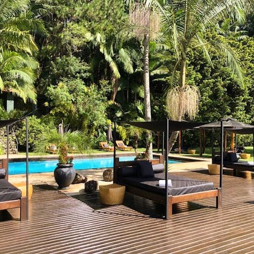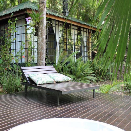 Além da suíte com bom tamanho, o bangalô tem privacidade e uma área externa com hidromassagem, tudo integrado ao máximo a um belo paisagismo.