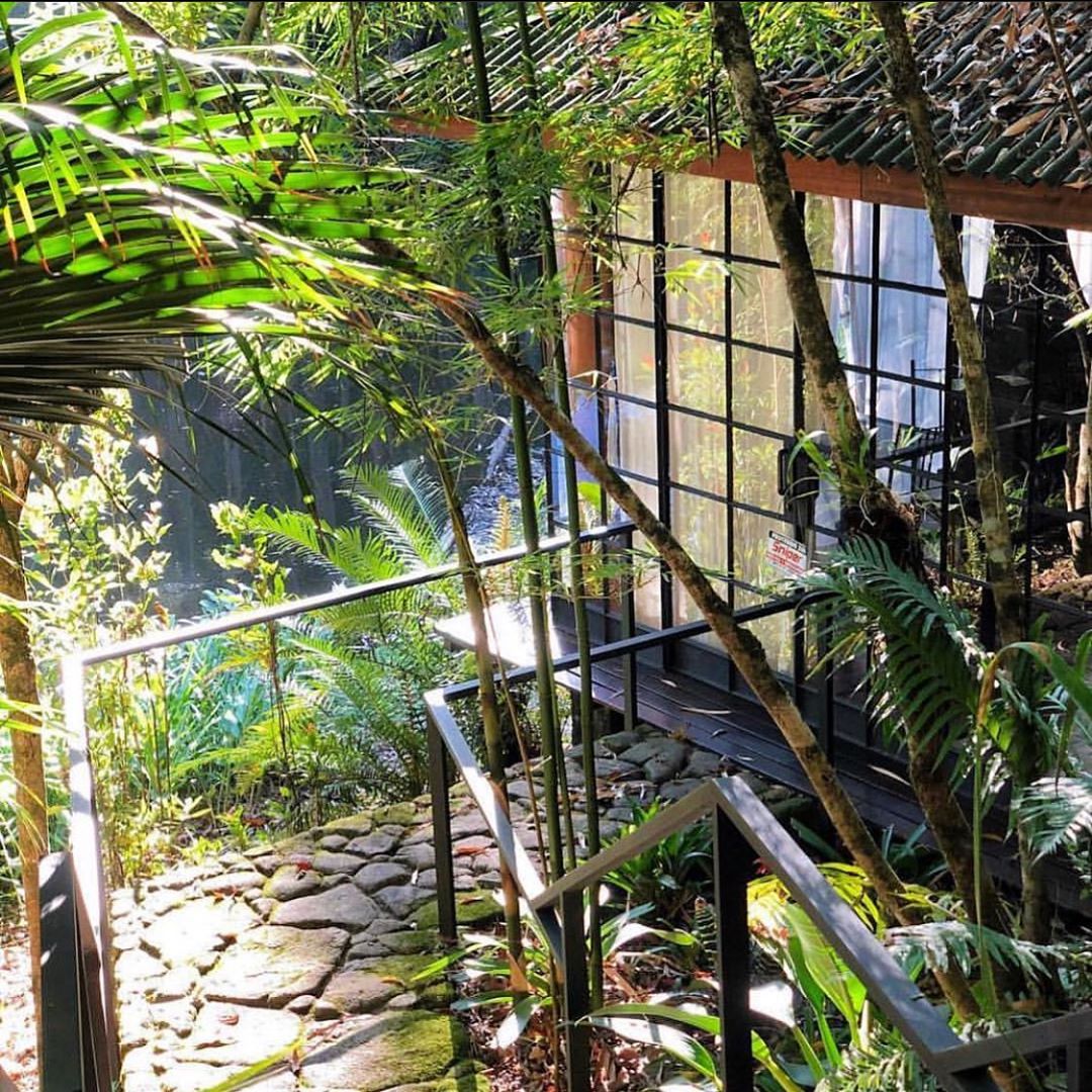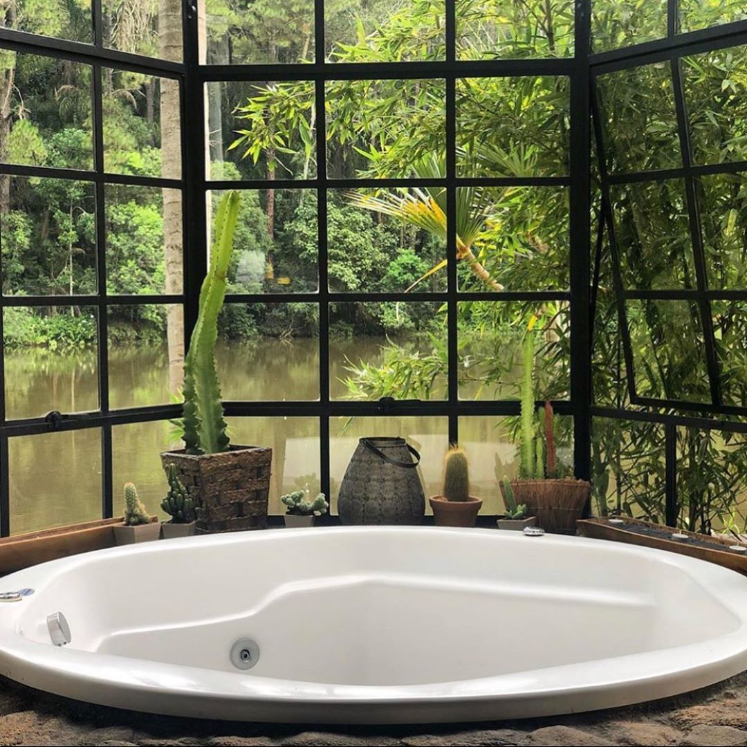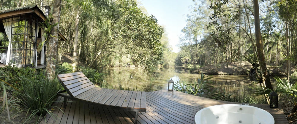 Além da suíte com bom tamanho, o bangalô tem privacidade e uma área externa com hidromassagem, tudo integrado ao máximo a um belo paisagismo.