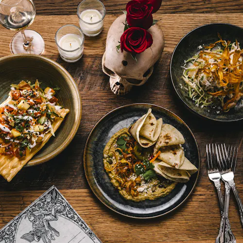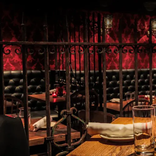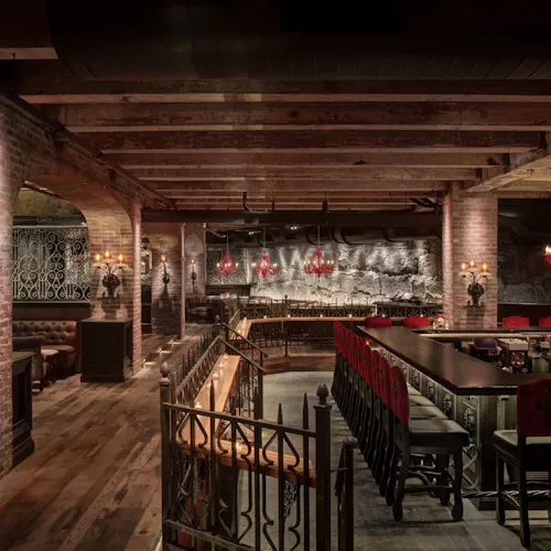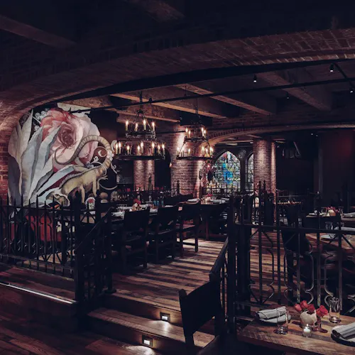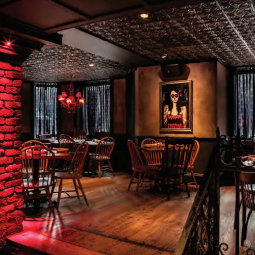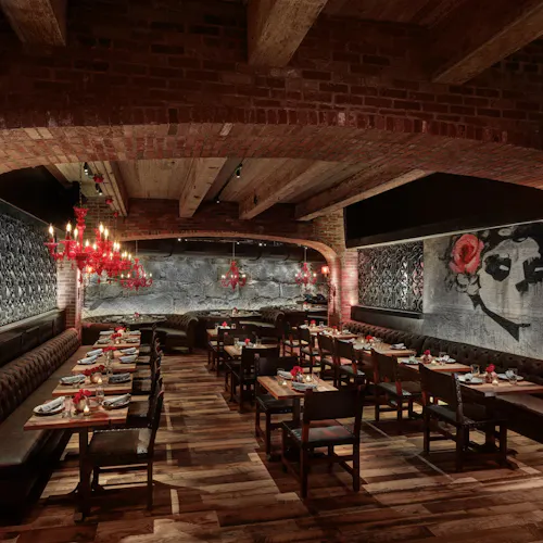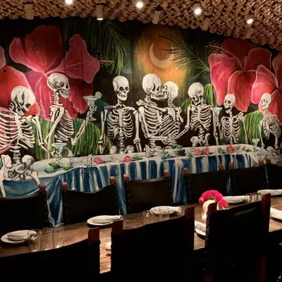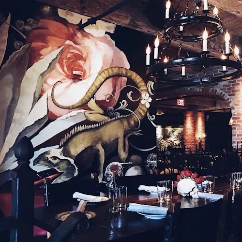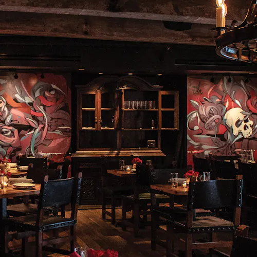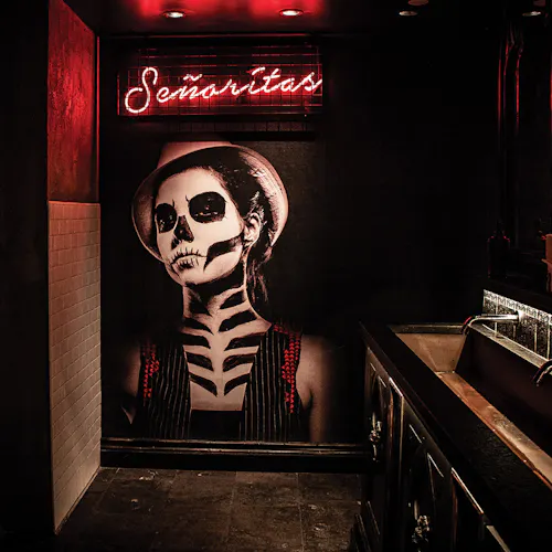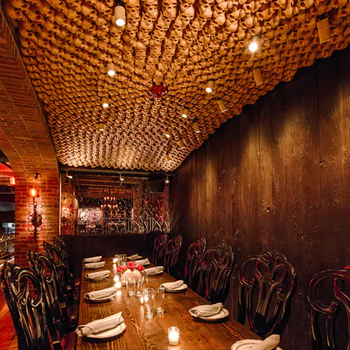 No interior a decoração é um show à parte: logo acima de uma grande mesa compartilhada dezenas de crânios fazem a forração do teto. As mesas são opções desde duas pessoas até lugares singulares no bar, mesas compartilhadas ou para grandes grupos e lounges com mesas e sofás.