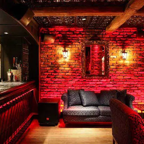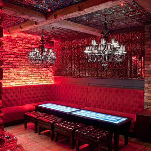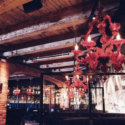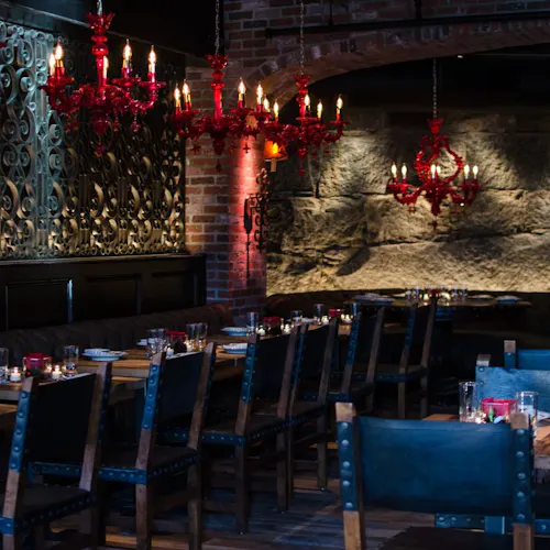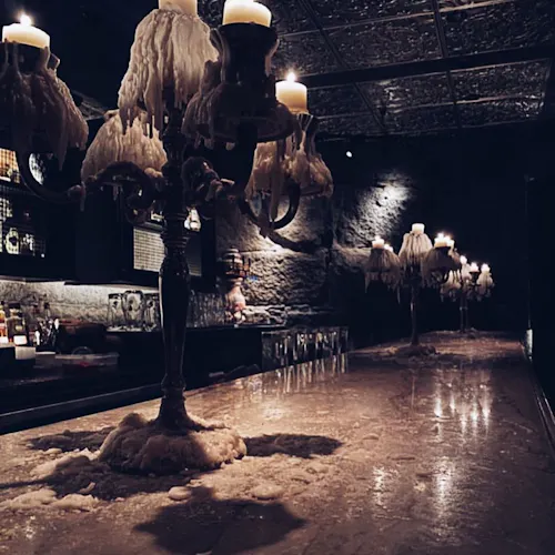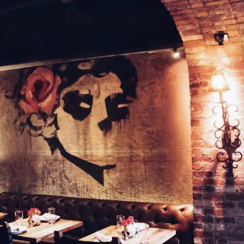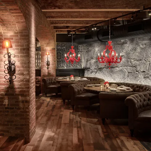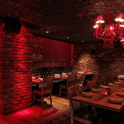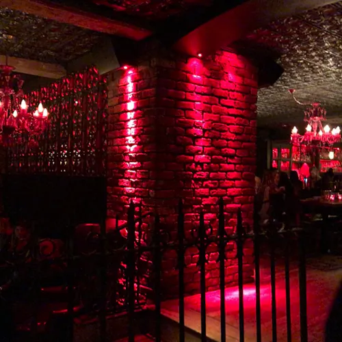 Além do restaurante estar localizado abaixo do nível da rua, a estrutura o faz parecer um misto de caverna- boate-restaurante-bar-galeria-cabaré e tem até alguns elementos que lembram uma catedral - vitrais coloridos e desenhados ornamentam a parte de trás do bar, cadeiras revestidas em veludo azul e vermelho, poltronas e sofás de couro preto, paredes de tijolos e pedras e velas pra todo lado. Entre as mesas, divisórias de grades em metal que ao sentar deixam quase uma sensação de cela. Iluminação escurecida com pontos de cor em vermelho dão um tom vigoroso e sensual. A parte artística fica por conta das paredes com pinturas de caveiras mexicanas em todo ambiente - as caveiras inclusive estão presentes em adornos que chegam junto com os drinks e em artigos de decoração nas mesas. Nem o banheiro fica de fora - além das paredes até os vasos sanitários têm artes que parecem azulejos pintados.