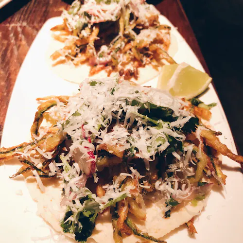 Entre as opções de porções estão o Grilled Street Corn que é um uma espiga de milho grelhada no fogo com maionese de chipotle, queijo cotija e tempero salgado de limão com pimenta (ISSO AQUI É INSANO DE DELICIOSO!!!). Pra quem ama pão: não deixe de provar o pão de milho estilo mexicano assado em frigideira de ferro com molho de alho por cima. É um pão firme com uma consistência de pudim ao centro. Além é claro, das diversas opções de tacos abertos com receitas inusitadas e combinações que dá vontade de pedir um de cada. Vegetarianos também tem vez no local! Há diversas opções com alternativas sem carne.