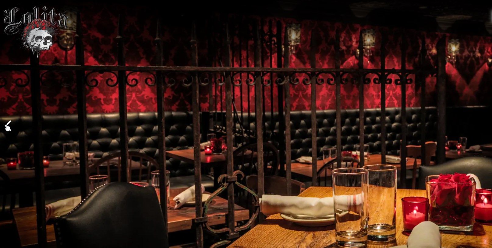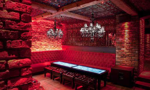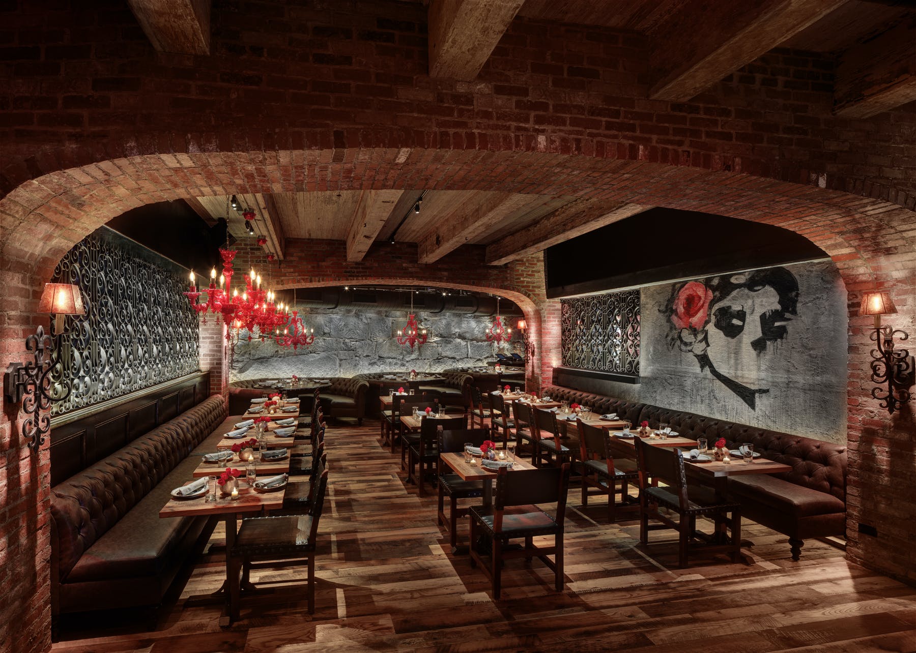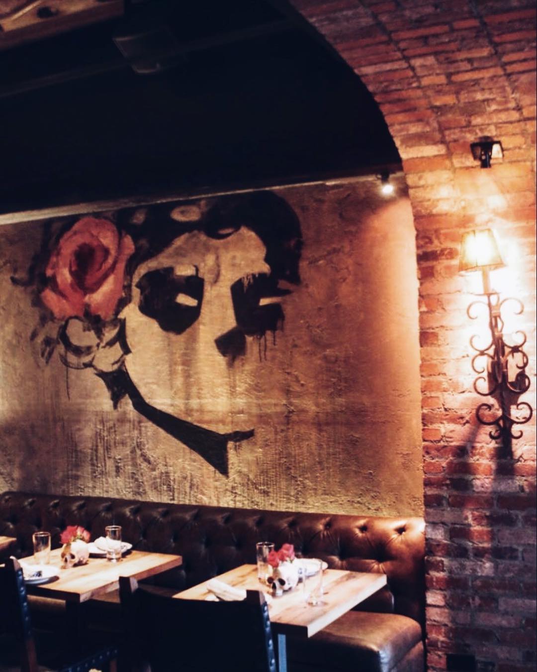 Além do restaurante estar localizado abaixo do nível da rua, a estrutura o faz parecer um misto de caverna- boate-restaurante-bar-galeria-cabaré e tem até alguns elementos que lembram uma catedral - vitrais coloridos e desenhados ornamentam a parte de trás do bar, cadeiras revestidas em veludo azul e vermelho, poltronas e sofás de couro preto, paredes de tijolos e pedras e velas pra todo lado. Entre as mesas, divisórias de grades em metal que ao sentar deixam quase uma sensação de cela. Iluminação escurecida com pontos de cor em vermelho dão um tom vigoroso e sensual. A parte artística fica por conta das paredes com pinturas de caveiras mexicanas em todo ambiente - as caveiras inclusive estão presentes em adornos que chegam junto com os drinks e em artigos de decoração nas mesas. Nem o banheiro fica de fora - além das paredes até os vasos sanitários têm artes que parecem azulejos pintados.