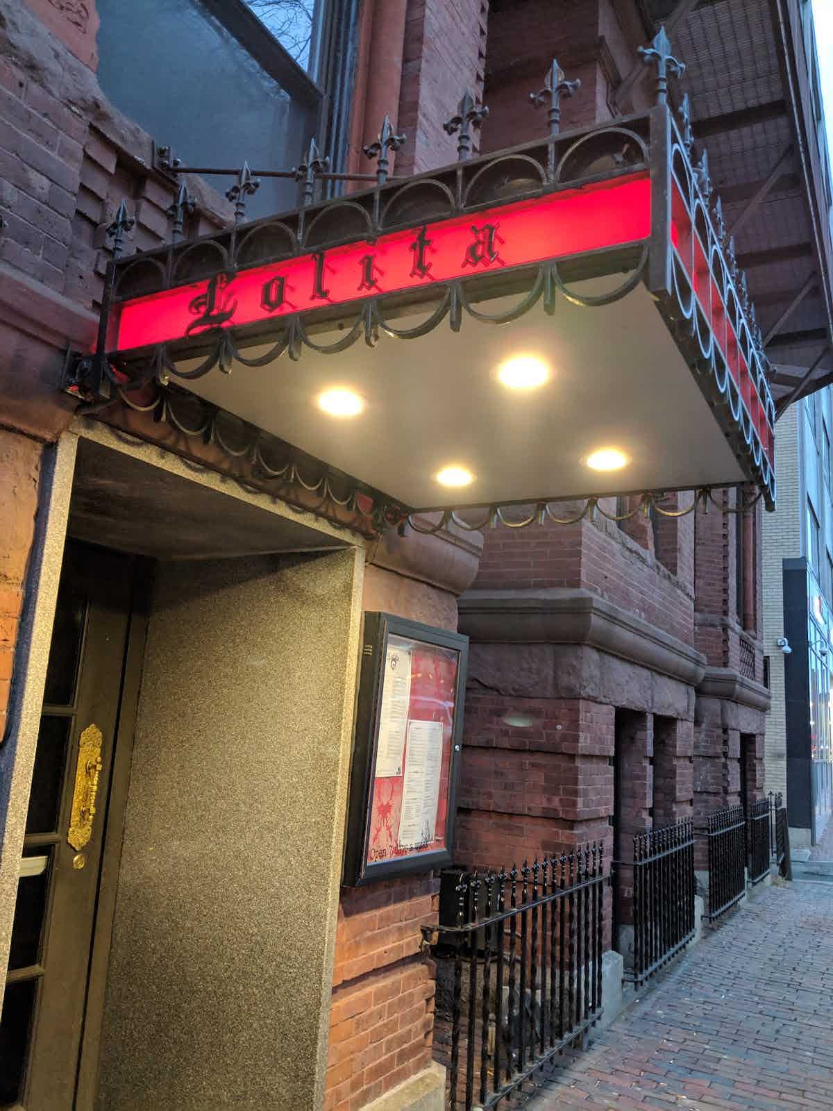 Apenas um pequeno toldo vermelho sobre uma porta na calçada - a fachada é discreta e quase escondida.