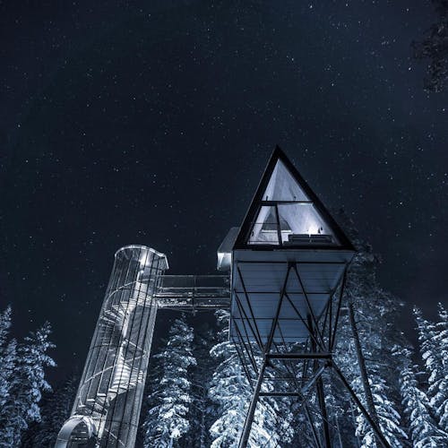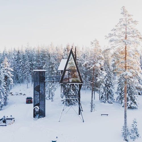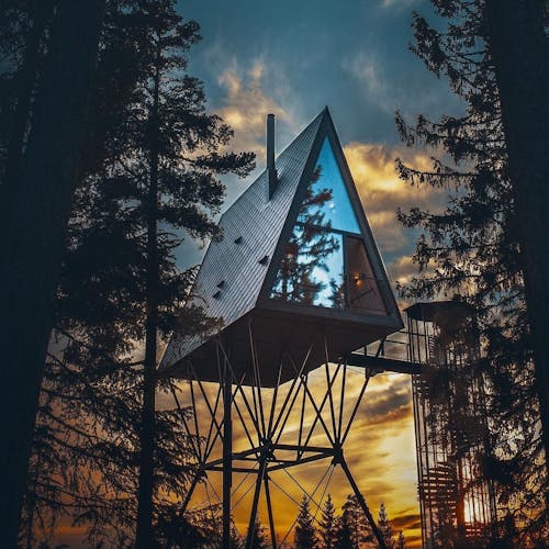 As cabanas em estilo A Frame são elevadas oito metros acima do solo. Elas não estão presas às árvores, mas ficam sobre uma estrutura que está ancorada em rocha sólida. Foi projetada dessa forma tanto por razões estéticas quanto de segurança.