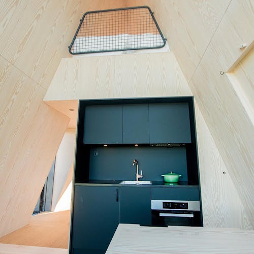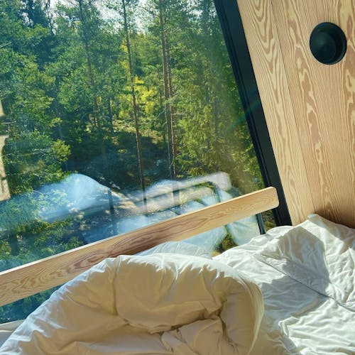 O ângulo e a localização das cabanas foram cuidadosamente ajustados ao sol, a fim de proporcionar uma experiência ideal da luz natural e da natureza a qualquer momento. As grandes fachadas de vidro permitem a entrada de toda a luz natural e ao mesmo tempo aquecem a área de estar. O design eficiente da cabana, minimiza naturalmente o gasto de energia e, portanto, apóia a visão de criar uma atividade recreativa com consciência ambiental. Os materiais, o interior e o piso foram todos escolhidos especificamente para aderir aos princípios sustentáveis. Isso combina com a iluminação natural para que você se sinta como se estivesse sentado na natureza, mesmo dentro de casa. No fim do dia, os hóspedes aproveitam a cabana para assistir ao pôr do sol em uma paisagem que se transforma lentamente em noite, enquanto os sons da floresta mudam conforme a luz diminui. Um princípio essencial e muito importante é que as cabanas fiquem integradas ao ambiente de uma forma não invasiva. O pensamento é de que você deve ser capaz de removê-las e não ser capaz de ver nenhum traço de atividade humana ser deixado para trás.