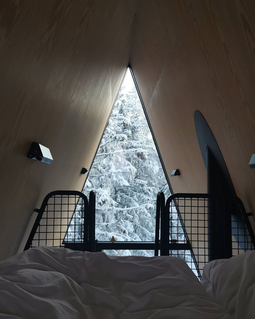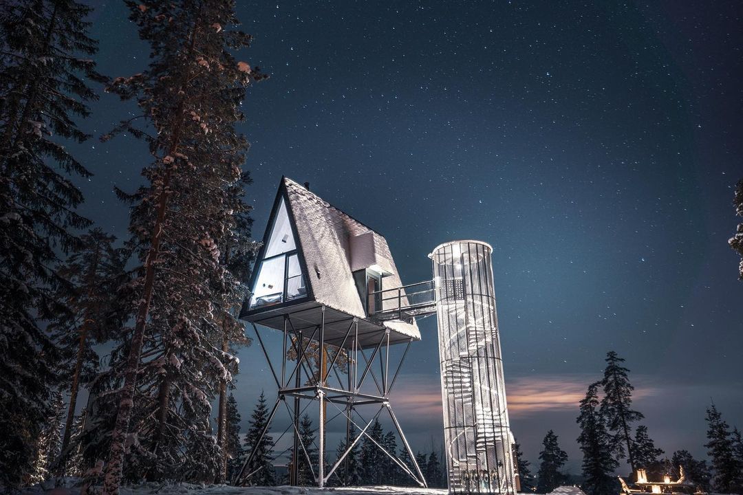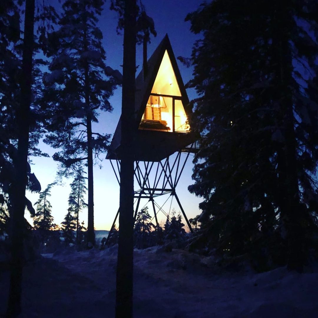 A cabana A Frame 8 metros acima do chão que hospeda até seis pessoas na floresta com ursos, lobos, alces e muita vida selvagem