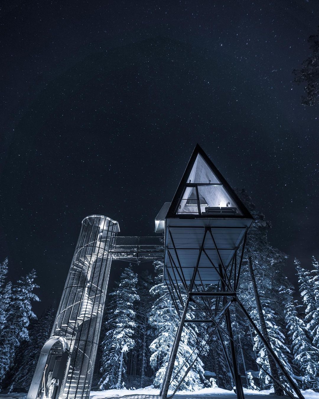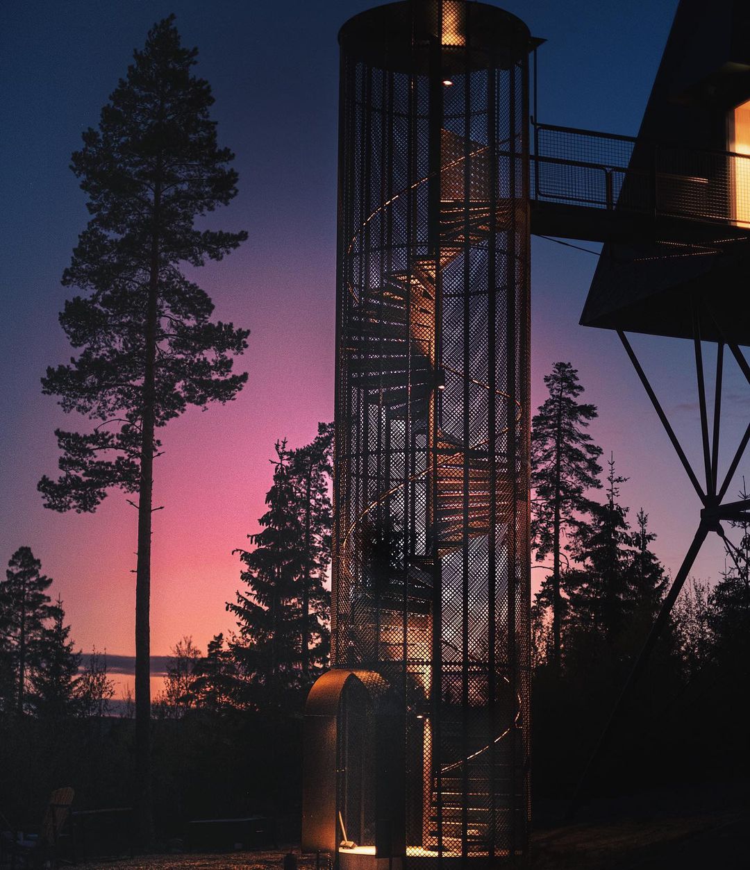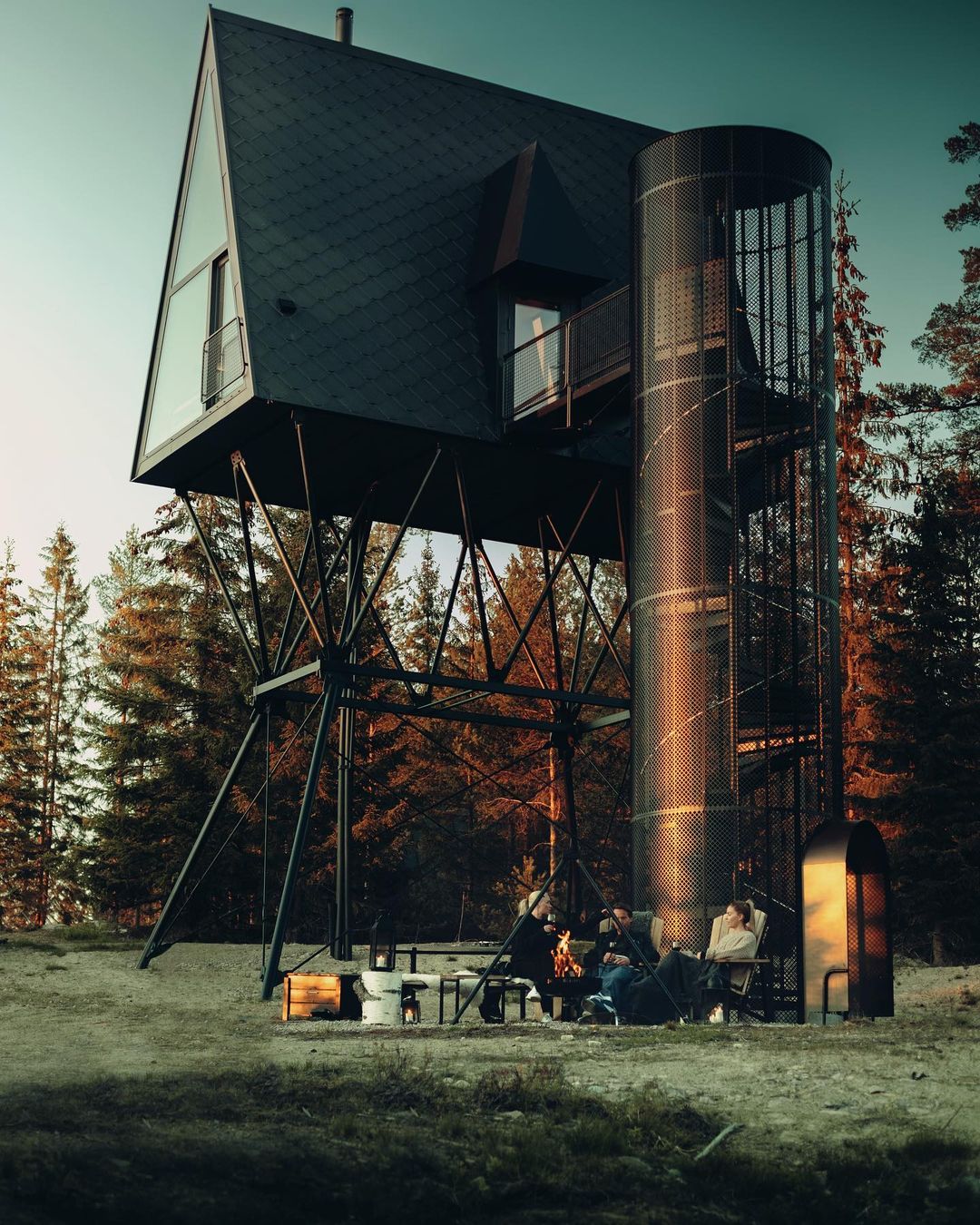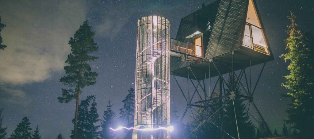 Uma escada em caracol envolta em um cilindro com fio leva até a cabina. A luz natural permeia a fiação que compõe o cilindro. Abaixo das cabines, há peças de aço trançado que servem de apoio. As cabanas não são fixadas às árvores por medida de segurança e preservação da natureza. Em vez de sentir o balanço das cabanas com o vento, as árvores se moverão enquanto as construções permanecem paradas. Cada uma é colocada no topo de quatro pilares que são ancorados em solo rochoso natural, o que as torna tão seguras quanto uma casa construída no solo. As PAN foram construídas para resistir à força de mais de dois furacões, tornando-as seguras para qualquer condição climática que esta parte da Noruega venha a enfrentar.