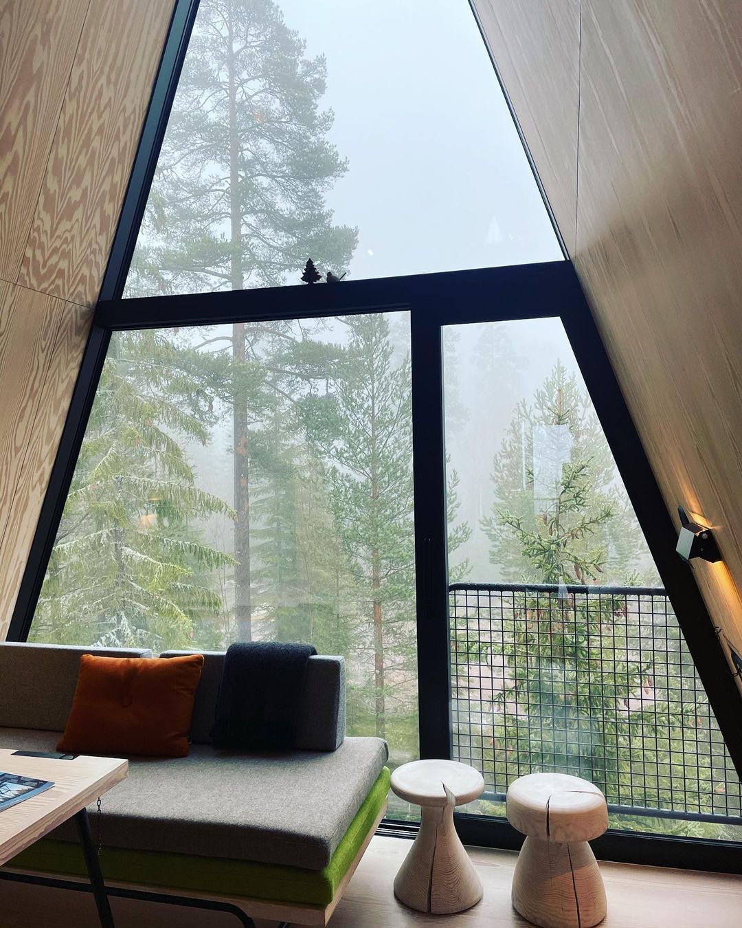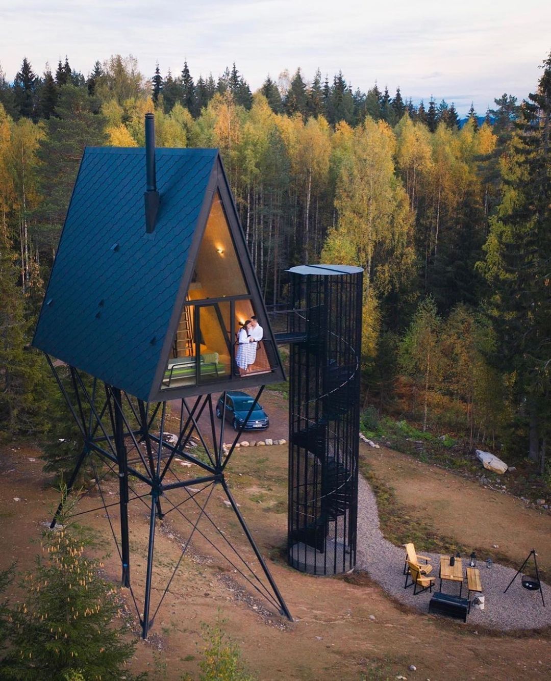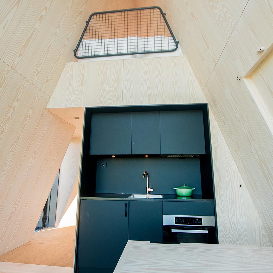 As cabanas em estilo A Frame são elevadas oito metros acima do solo. Elas não estão presas às árvores, mas ficam sobre uma estrutura que está ancorada em rocha sólida. Foi projetada dessa forma tanto por razões estéticas quanto de segurança.
