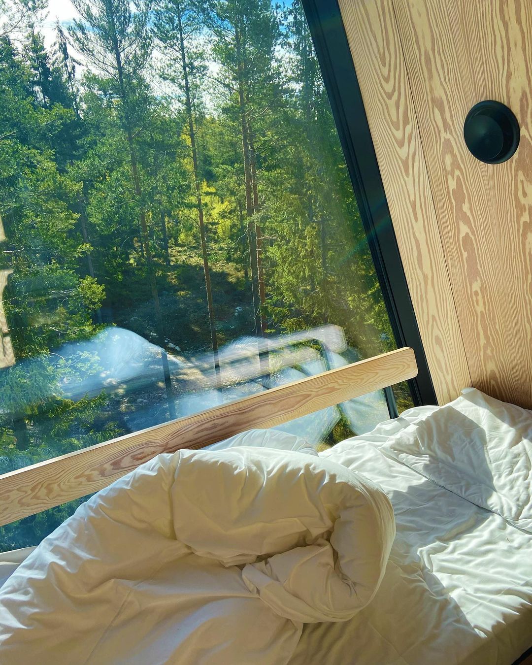 O ângulo e a localização das cabanas foram cuidadosamente ajustados ao sol, a fim de proporcionar uma experiência ideal da luz natural e da natureza a qualquer momento. As grandes fachadas de vidro permitem a entrada de toda a luz natural e ao mesmo tempo aquecem a área de estar. O design eficiente da cabana, minimiza naturalmente o gasto de energia e, portanto, apóia a visão de criar uma atividade recreativa com consciência ambiental. Os materiais, o interior e o piso foram todos escolhidos especificamente para aderir aos princípios sustentáveis. Isso combina com a iluminação natural para que você se sinta como se estivesse sentado na natureza, mesmo dentro de casa. No fim do dia, os hóspedes aproveitam a cabana para assistir ao pôr do sol em uma paisagem que se transforma lentamente em noite, enquanto os sons da floresta mudam conforme a luz diminui. Um princípio essencial e muito importante é que as cabanas fiquem integradas ao ambiente de uma forma não invasiva. O pensamento é de que você deve ser capaz de removê-las e não ser capaz de ver nenhum traço de atividade humana ser deixado para trás.