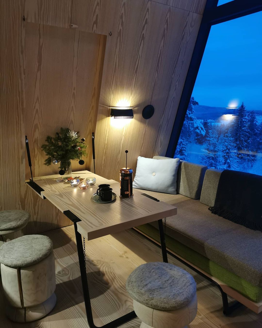 As cabanas têm 40m2, eletricidade, chuveiro, cozinha e três dormitórios separados. Com camas confortáveis e grandes janelas, os hóspedes irão acordar com uma vista panorâmica sobre Finnskogen.