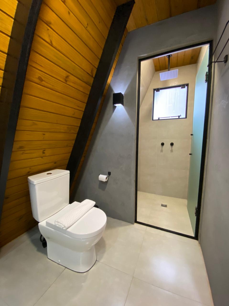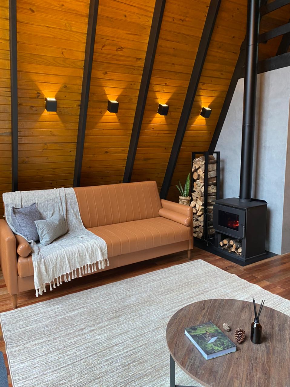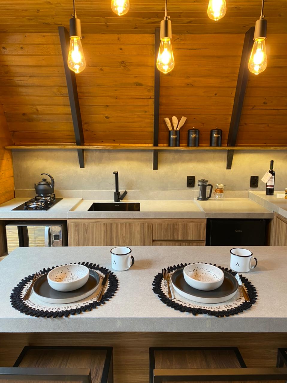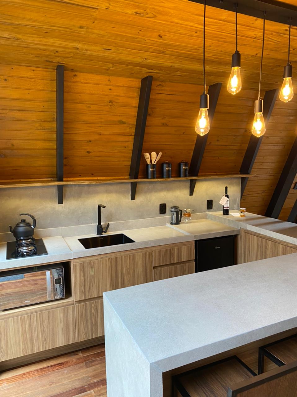 Os responsáveis pelo projeto da cabana são a equipe do escritório Setta Arquitetura, que tem um know-how incrível nesse tipo de construção, e a parte da decoração interna ficou com o time da Naindry Arquitetura, deixando o direcionamento da área interna para ficar focada no conforto dos hóspedes, por isso quem se hospedar por lá pode esperar muito aconchego! Mesmo com muito frio no inverno da região, na cabana não se passa frio do lado de dentro, devido também à lareira canadense, que foi projetada para aquecer até o quarto no mezanino. No banho o chuveiro é a gás.